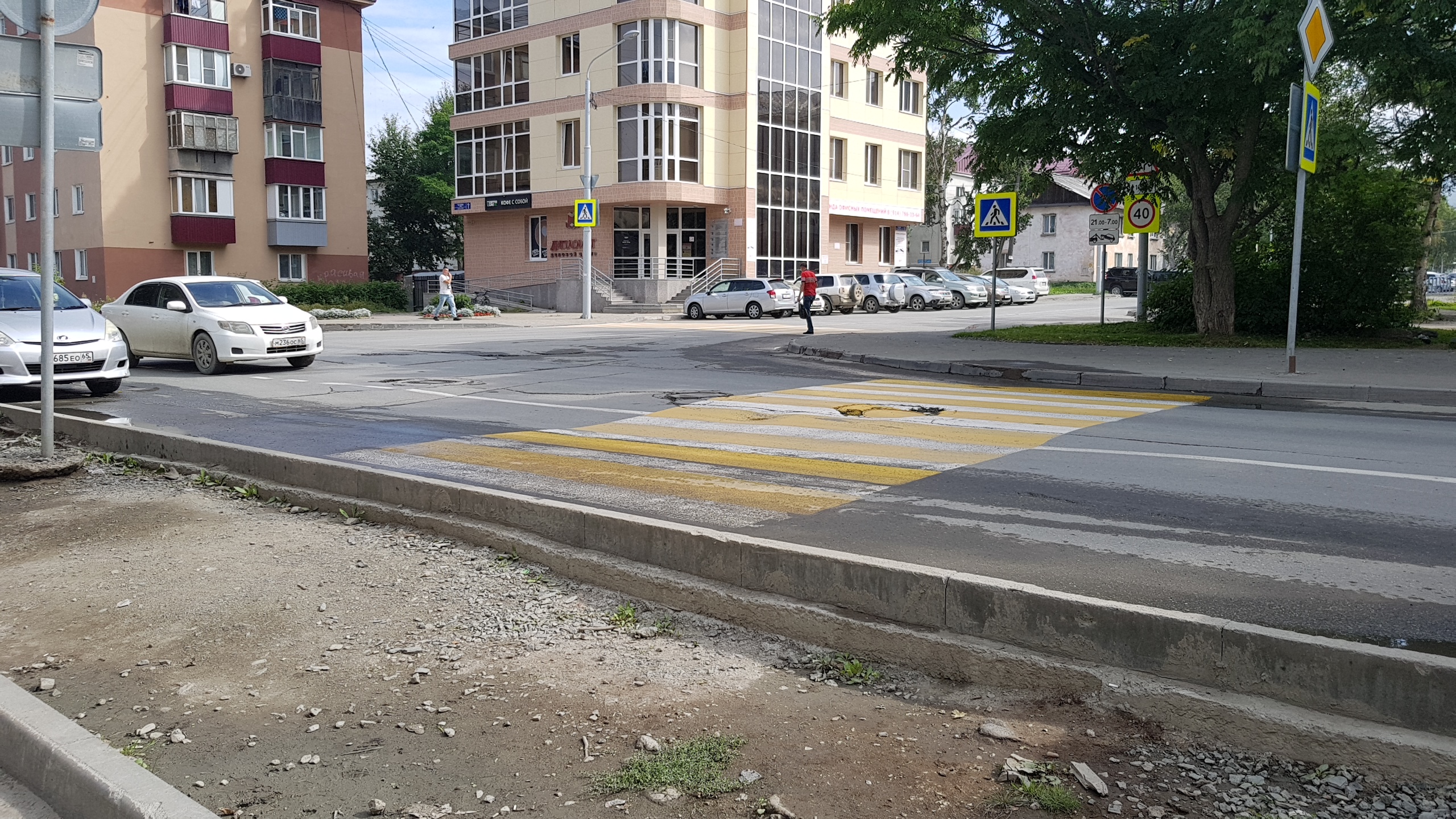 А ровно на середине перехода расположился люк с провалом дорожного покрытия, бережно раскрашенный в желто-белую расцветку. Видимо, провал дорожного покрытия не выходит за рамки требования ГОСТа.