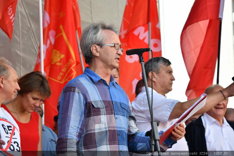 Эмоционально и образно выступил первый секретарь Московского горкома КПРФ В.Ф. Рашкин. «Все. Маски сброшены. Путин открыто выступил за повышение пенсионного возраста. Путин заодно с авторами людоедской «реформы». Предлагаю выразить недоверие Путину. Вы согласны?», – обратился он с предложением к участникам митинга. «Да!», – дружно стали скандировать они. Выступающий полагает, что в этом единоборстве против пенсионного законопроекта победу в конечном итоге одержит народ. «Нас – миллионы. С нами – КПРФ. А за ними – единицы. Поэтому мы победим», – заявил оратор. Он напомнил, что Советская власть понижала пенсионный возраст в 1956 году, через 11 лет после тяжелейшей войны. В Китае к 2021 году планируют понизить пенсионный возраст для женщин – до 50 лет, а для мужчин – до 55 лет. Участники митинга поддержали его предложение отправить в отставку либеральное правительство во главе с Медведевым и требование роспуска Госдумы, где большинство составляет «Единая Россия». Участники митинга также скандировали лозунг: «Референдум! Референдум!».