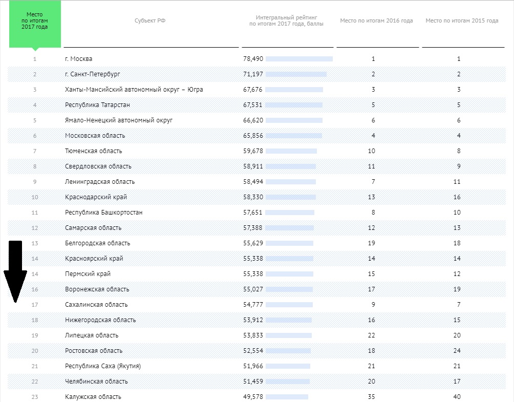 В опубликованном рейтинге социально-экономического положения субъектов РФ по итогам 2017 года Сахалинская область за три года теряет 10 позиций и занимает 17 место.