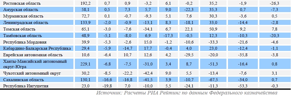 Наиболее существенно снизились позиции в рейтинге Томской области, которая опустилась с 30 места в рейтинге по итогам 2016 года до 45 места в рейтинге по итогам 2017 года. Позиции Оренбургской области снизились на 9 мест. Еще четыре региона опустились на 8 мест. Это Сахалинская область, Мурманская область, Тамбовская область, Чувашская Республика.