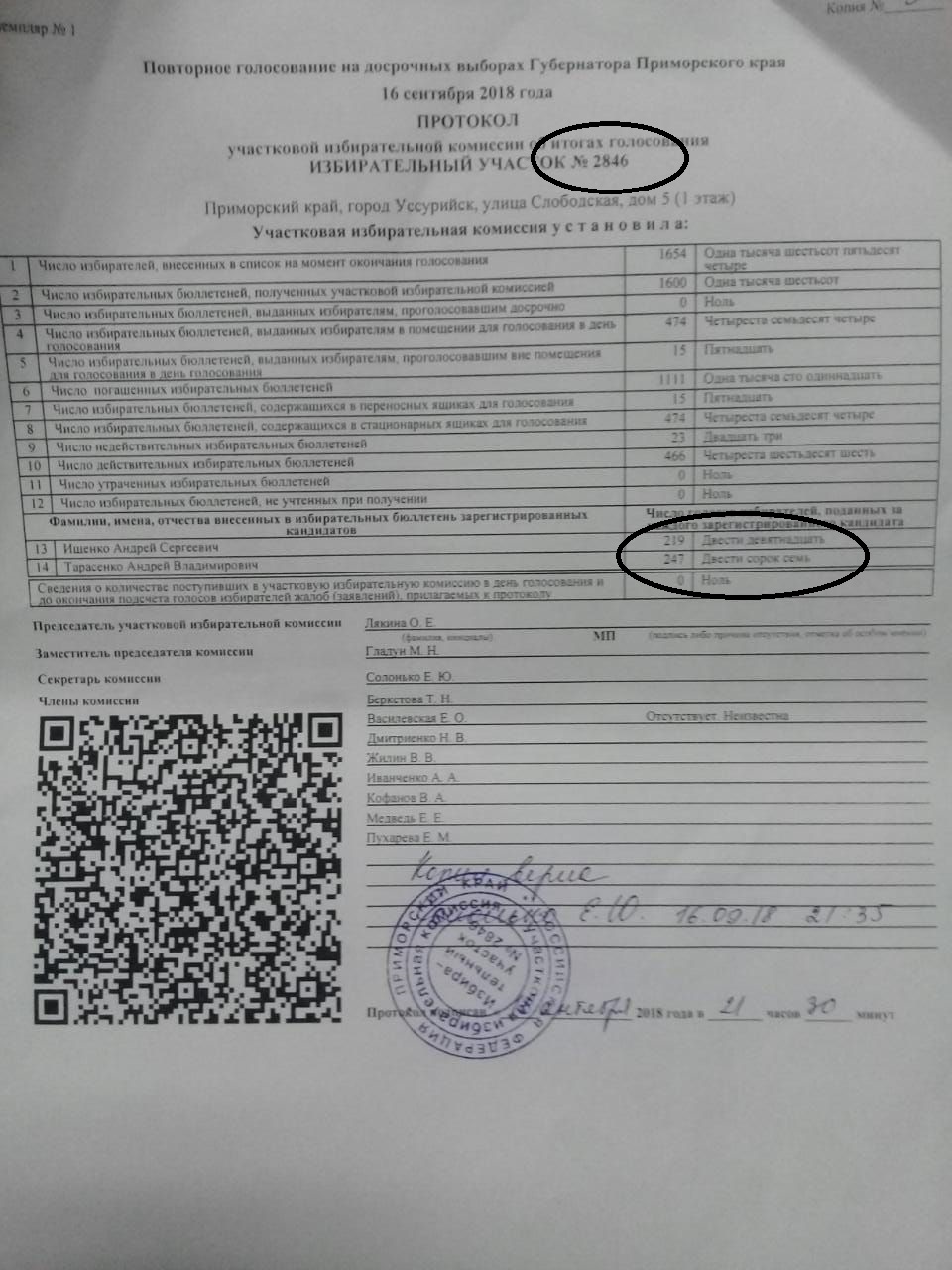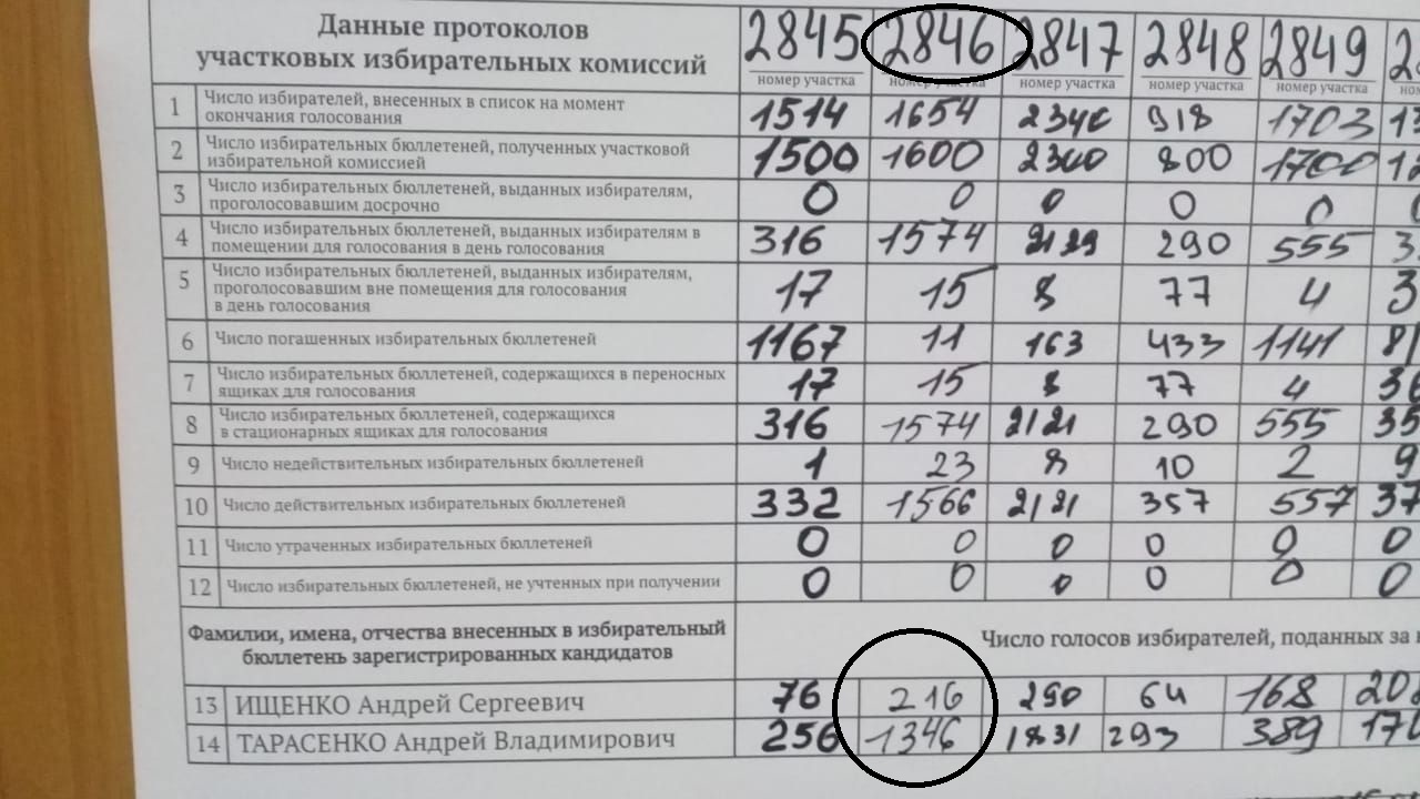 «Всего в Уссурийске выявлено пять участков, где переписаны протоколы, в каждом из них от 1 тыс. до 1,2 тыс. голосов дополнительно нарисованы кандидату Тарасенко», — сообщил он. По словам Ашихмина, речь идет о УИКах № 2846, 2819, 2838, 2862 и 2840. «Еще по двум участкам — УИК 2828, 2829 — у нас нет никаких данных», — добавил он, заметив, что председатели этих УИКов сбежали с участков с протоколами, и об их местонахождении ничего не известно.