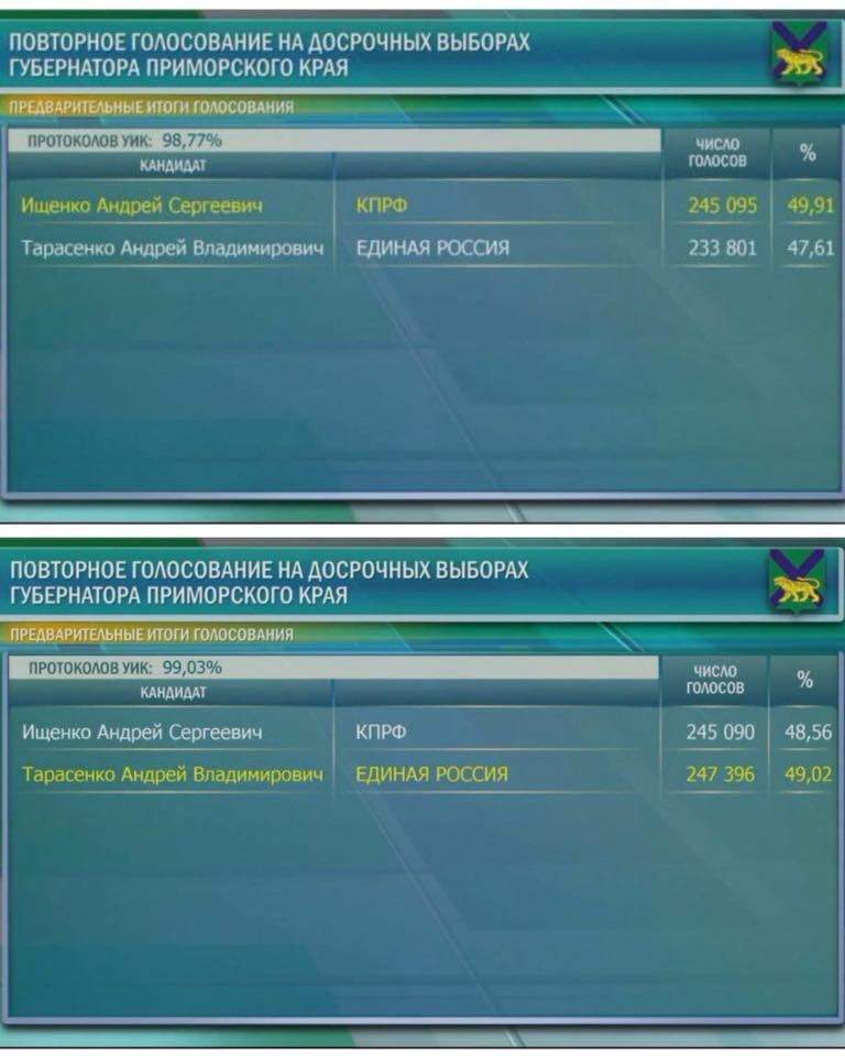 По последним данным Избирательной комиссии Приморского края, во втором туре на выборах губернатора лидирует коммунист Андрей Ищенко, а председатель УИК сбежала во время подсчета голосов.