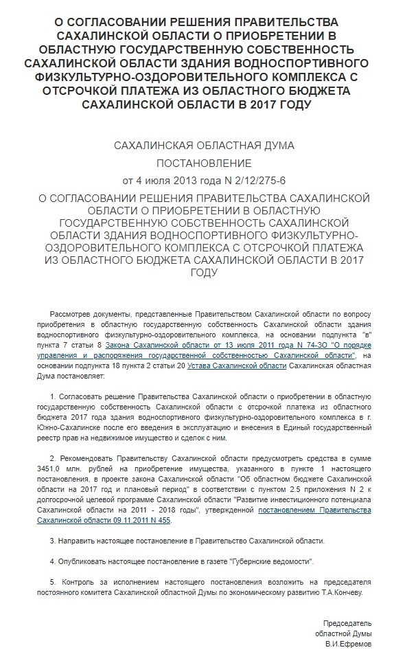 Сахалинская областная Дума принимает решение о финансировании тех или иных программ областного правительства. Принципиальная и важнейшая роль законодательного органа слегка поистрепалась со временем, и эта функция второй ветви власти трансформировалась в ставшую привычную практику одобрения предложений первой ветви – исполнительной. Баланс оказался слегка нарушен. Однако, в 2013 году появилось на свет Постановление, в котором недвусмысленно сказано: “…согласовать приобретение с отсрочкой платежа из областного бюджета в 2017 году (???) после его введения в эксплуатацию и постановку объекта на учет в ЕГРП”. Вторым пунктом законодатели рекомендуют предусмотреть более 3 млрд 400 млн рублей на оплату этой сделки из средств областного бюджета.