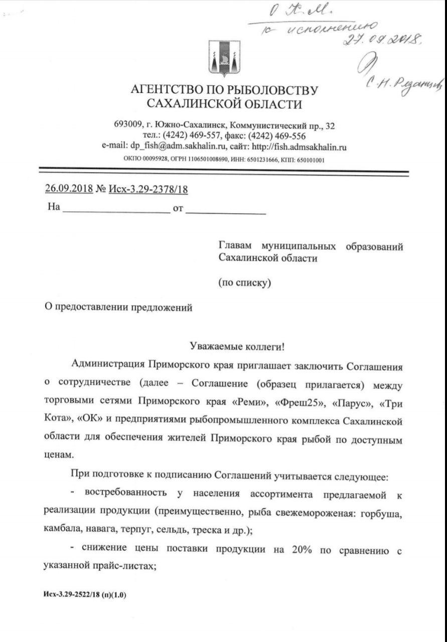 Агентство по рыболовству Сахалинской области, в ведение которого входят вопросы регулирования рынка на островах, решает для себя, что сахалинские предприниматели, могут (а может должны?) принять участие в насыщении розничного рынка Приморского края, а именно избранных торговых сетей – Реми, Фреш25, Парус, Три Кота, и ОК, островным лососем. При этом цена должна быть на 20% ниже, чем существующие предложения.