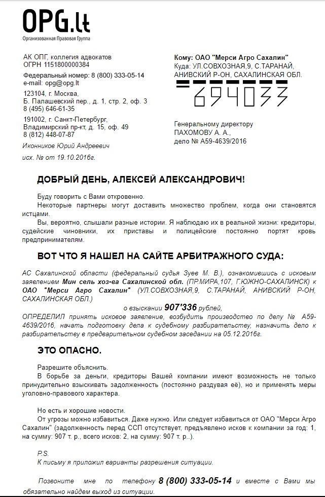 Эта же форма собственности (ОАО) упоминается в конце 2016 года в переписке между адвокатской конторой OPG и Генеральным директором по делу № А59-4639/2016, которое предлагала руководителю свинноводческого комплекса свою помощь в арбитражном суде. В своем письме юристы так же предлагали варианты «решения проблемы» – банкротство компании или ее офшоризацию.