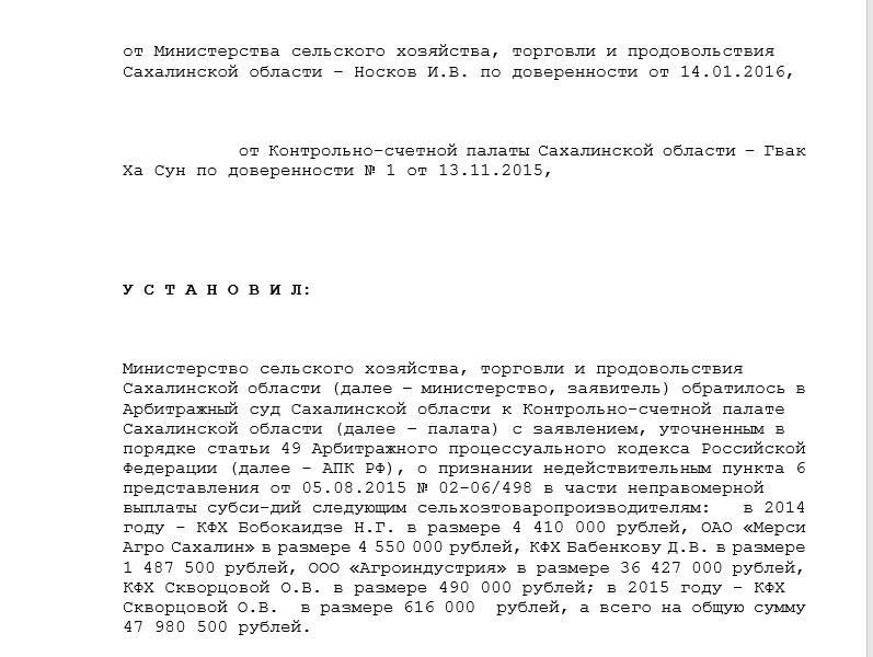 Если принять во внимание основного получателя бюджетных средств, то им, в настоящее время, является АО «Мерси Агро Сахалин». ОАО «Мерси Агро Сахалин» является предшественником АО и имеет с ним общий ИНН 6501256318. В какой исторический момент происходит реорганизация мы точно не смогли установить, однако в материалах суда ОАО упоминается еще в январе 2016 года. В так называемый «постхорошавинский период». В этих материалах рассматривается законность выделения государственной субсидии в адрес ОАО «Мерси Агро Сахалин», истцом по делу выступало Министерство сельского хозяйства, торговли и продовольствия Сахалинской области.