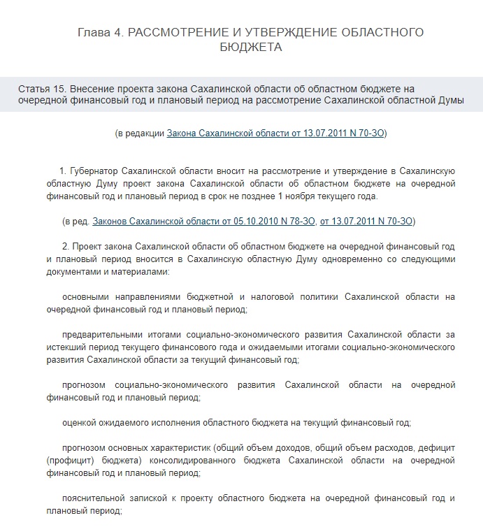 До 24 часов 1 ноября 2018 года губернатор Сахалинской области обязан внести на рассмотрение и утверждение в Сахалинскую областную Думу проект закона Сахалинской области об областном бюджете на очередной финансовый год и плановый период – сообщает закон Сахалинской области “О бюджетном процессе в Сахалинской области”.