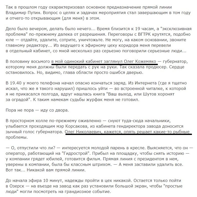 С того самого репортажа, который снимали на территории рыболовецкого предприятия в селе Озерское, с территории «Гидростроя» бывшего сенатора Александра Верховского, где ход съемок буквально контролировал Олег Кожемяко.