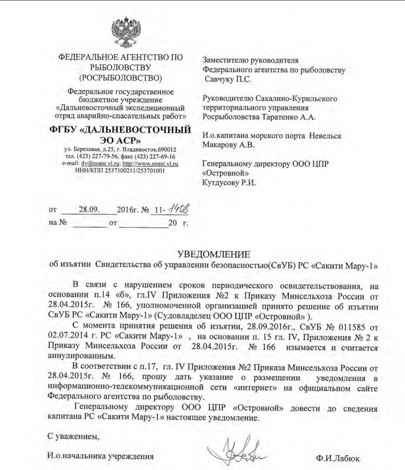 Собственником судна СДС «Сакити Мару-1» являлся генеральный директор ООО «Центр прибрежного рыболовства «Островной» гражданин РФ Попов А.Н. Он же является генеральным директором всем известного ЗАО «Островной» и ООО Рыбокомбинат «Островной». В отношении него в настоящее время ведутся уголовные дела по целому спектру статей (145, 173, 159 УК РФ).