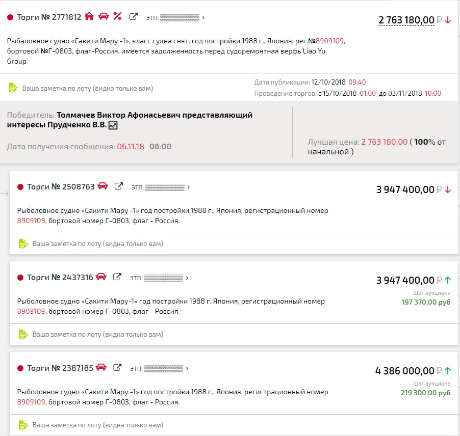 Толмачев В.А. который представлял на торгах интересы Прудченко В.В., является адвокатом и систематически оказывает юридическую помощь капитанам браконьерских судов, задержанных за ННН-промысел краба (ННН – незаконный, несообщаемый и нерегулируемый).
