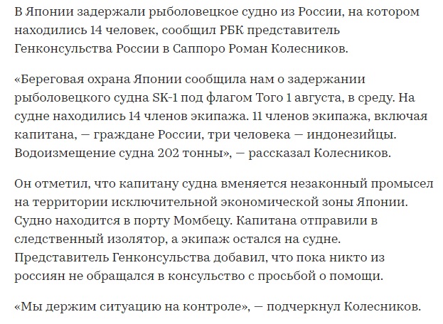 «Первого августа 2018 года, в акватории южной части Охотского моря (исключительная экономическая зона Японии, северо-восточнее порта Момбецу, остров Хоккайдо, Япония) силами УБО Японии 1-го района, за невыполнение требований об остановке, задержано судно «SK-1» (флаг Тоголезской Республики, порт приписки Ломе, IMO 8909109, капитан – Иван Кучеренко, экипаж- 14 человек). Уже второго августа после внесения залога в размере 3 млн. иен, судно «SK-1» вышло из порта Момбецу и проследовало в КНР для сдачи незаконно добытого краба.