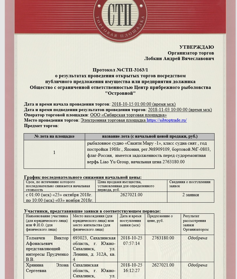 Так как ЗАО «Рыбокомбинат островной» был признан несостоятельным (банкротом) и в отношении него было открыто конкурсное производство, его имущество распродается.