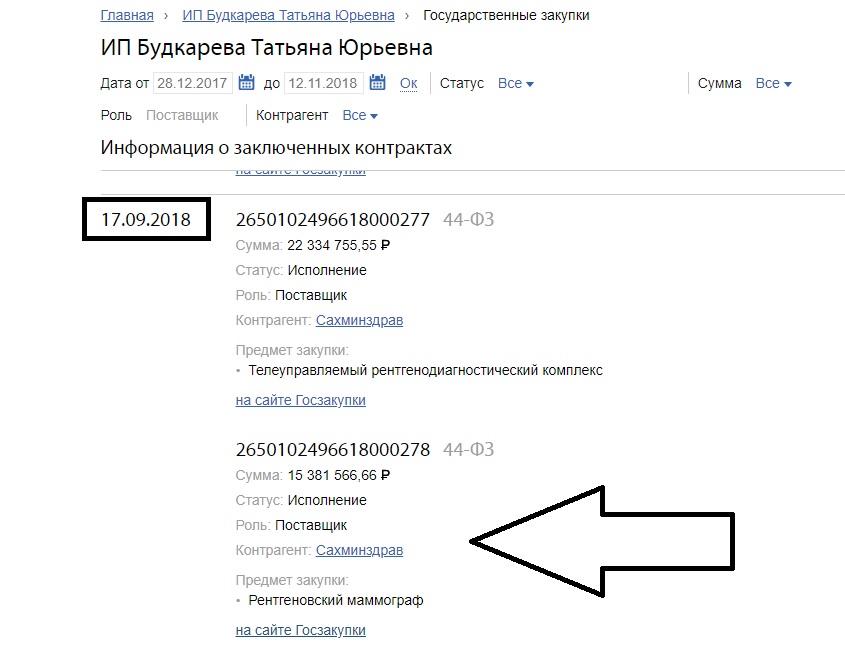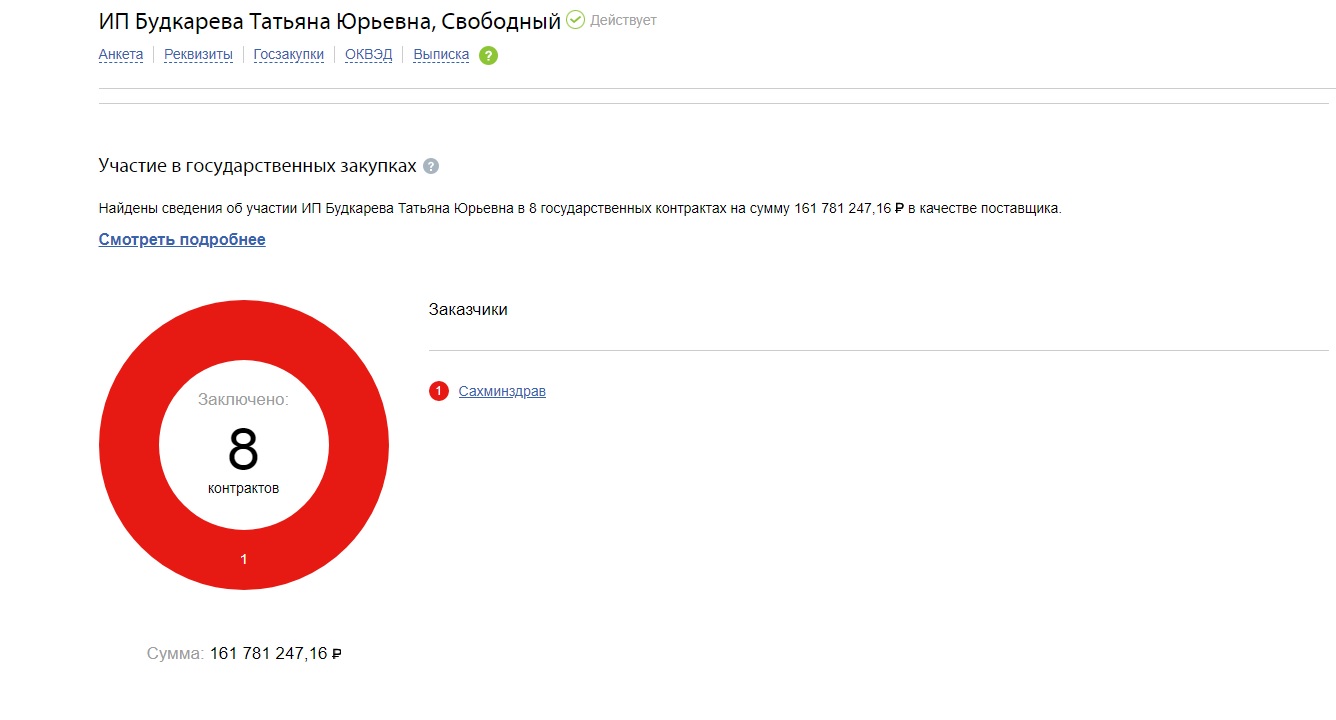 Еще один успешный предприниматель, который пришел к нам из Амурской области. Она, в качестве индивидуального предпринимателя, поставляет сахалинскому Минздраву оборудование. Сумма поставок уже превысила 161 млн рублей.