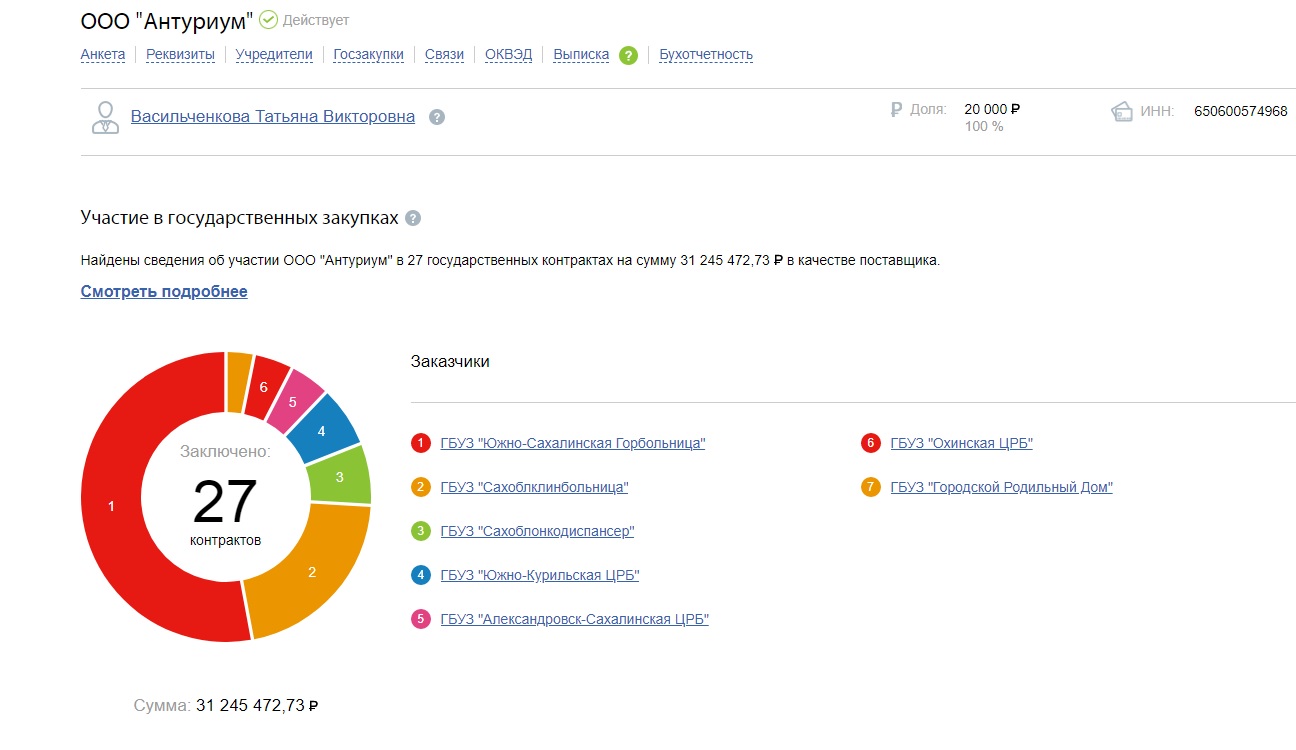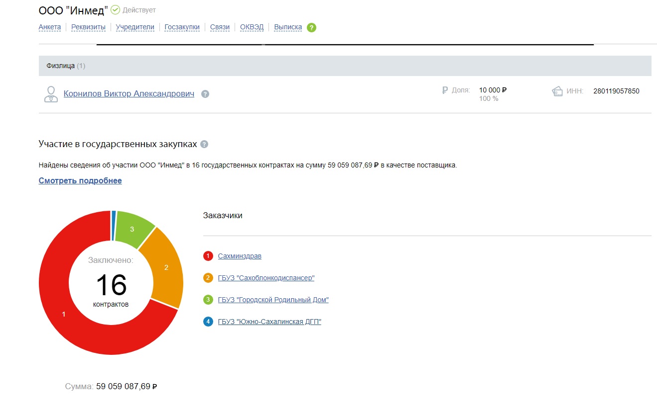 Буквально за год среди его заказчиков оказались: Сахминздрав, ГБУЗ «Сахоблонкодиспансер», ГБУЗ «Городской Родильный Дом» и ГБУЗ «Южно-Сахалинская Детская Городская Поликлиника», заключено 16 государственных контрактов на сумму более 59 млн рублей.
