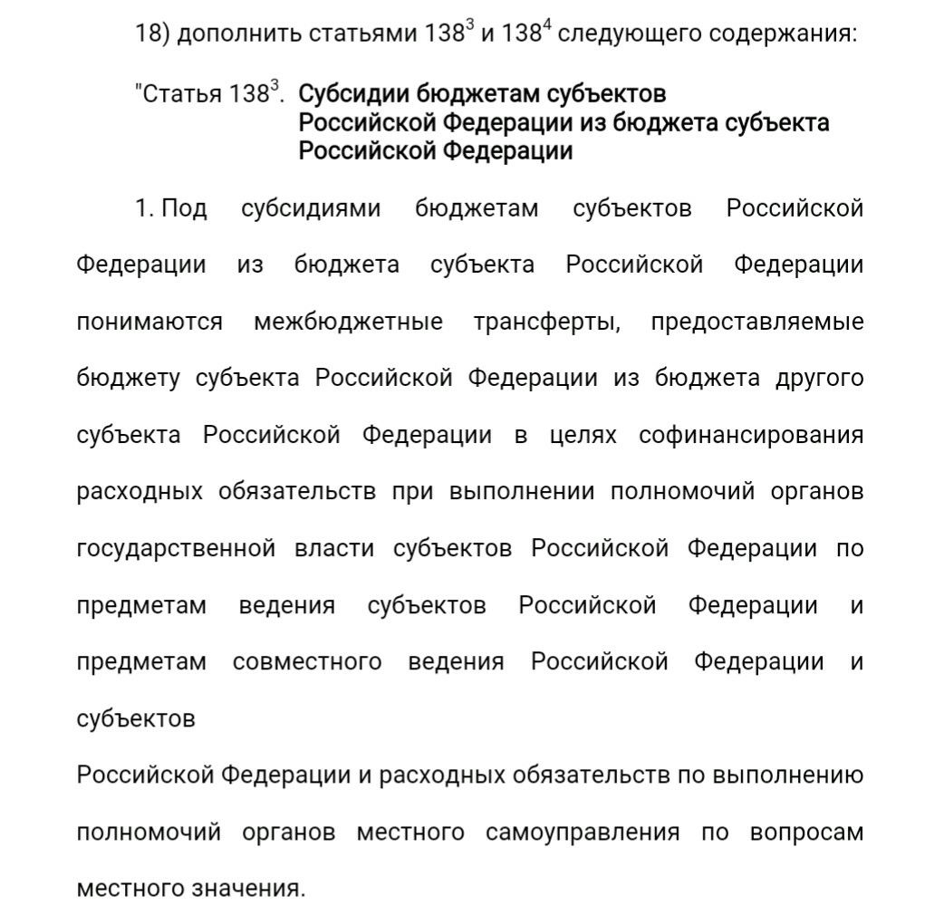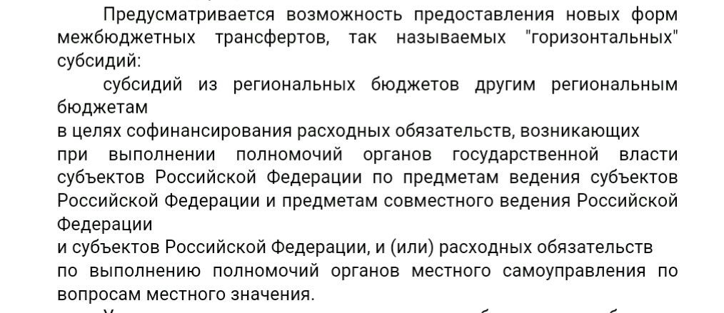 В случае, если госдума примет эти изменения, в ход пойдут так называемые «горизонтальные субсидии». Главы субъектов (губернаторы или врио (!!!) получат право за закрытыми дверями кабинетов заключать между субъектами соглашение о финансировании социальных обязательств и иных программ в соседнем регионе за счет средств бюджета «донора».