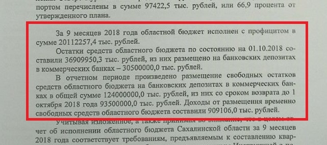 Напомним, федерально-целевая программа развития Курильских островов получает финансирование, в том числе, из средств бюджета Сахалинской области. Правительству Сахалинской области, в период деятельности на островах губернатора Олега Кожемяко, удалось за 9 месяцев текущего года создать профицит бюджета в размере более 20 млрд рублей, а на депозитах в коммерческих банках, по состоянию на 1 октября 2018 года, находилось более 30 млрд рублей. Всего, в течении 2018 года, у правительства Сахалинской области были обнаружены “свободные остатки” бюджетных средств, которые размещались на депозитах в размере 124 млрд рублей.