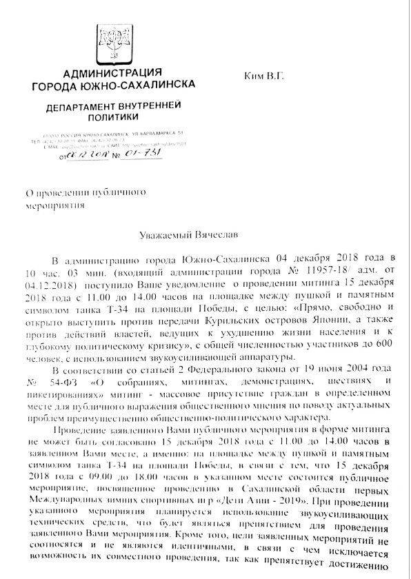 Администрация города Южно-Сахалинска отказала организаторам в проведении митинга, который был заявлен на 15 декабря 2018 года, 11 часов, на площади Победы областного центра. Чиновники говорят о том, что именно на этом месте и в то же самое время ими запланировано иное мероприятие, которое помешает проведению акции в защиту Курильских островов, сохранению территориальной целостности России и нерушимости послевоенных границ.