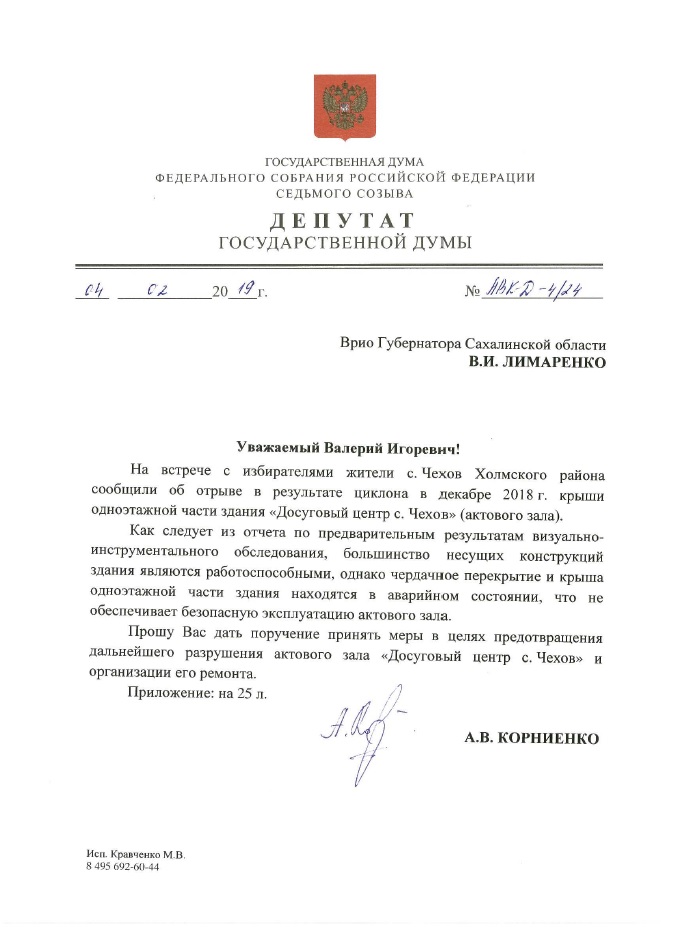 Депутат Государственной Думы Алексей Корниенко уже направил врио губернатора Сахалинской области Валерию Лимаренко официальное письмо в котором он предлагает принять меры по предотвращению дальнейшего разрушения Дома культуры.