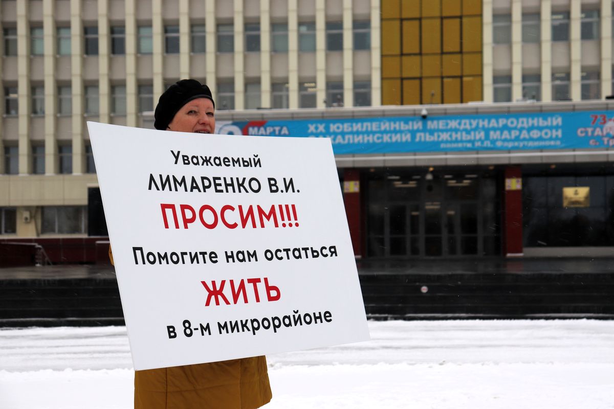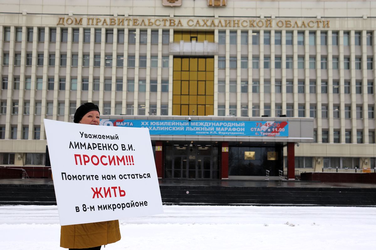 Перед началом рабочего дня, под окнами кабинета исполняющего обязанности губернатора Сахалинской области Валерия Лимаренко, прошел одиночный пикет. Выйти на улицу заставила застарелая проблема Южно-Сахалинска – жителей ветхих домов, расположенных в восьмом микрорайоне, администрация в очередной раз пытается выселить с привычного места жительства, позабыв обещания Сергея Надсадина.
