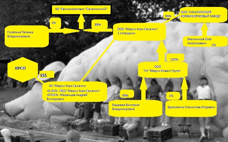 Есть основание полагать, что проверка использования бюджетных средств, которые идут на финансирование свиней в Анивском районе, уже назрела. Проверка, которая могла бы подсветить роли всех хозяйствующих субъектов в деле разведения свиней, роль их учредителей, движение финансовых потоков. Как бы государственные активы не “убежали” в АО “Свинокомплекс “Сахалинский” , которого не видели даже депутаты облдумы, в котором нет сотрудников , а прибыль отрицательная. Тем более, что Голятина Татьяна Владимировна (на схеме выше) уже неоднократно участвовала в процедуре ликвидации юридических лиц, а в настоящее время контролирует всю агропромышленную группу “Мерси Агро”.
