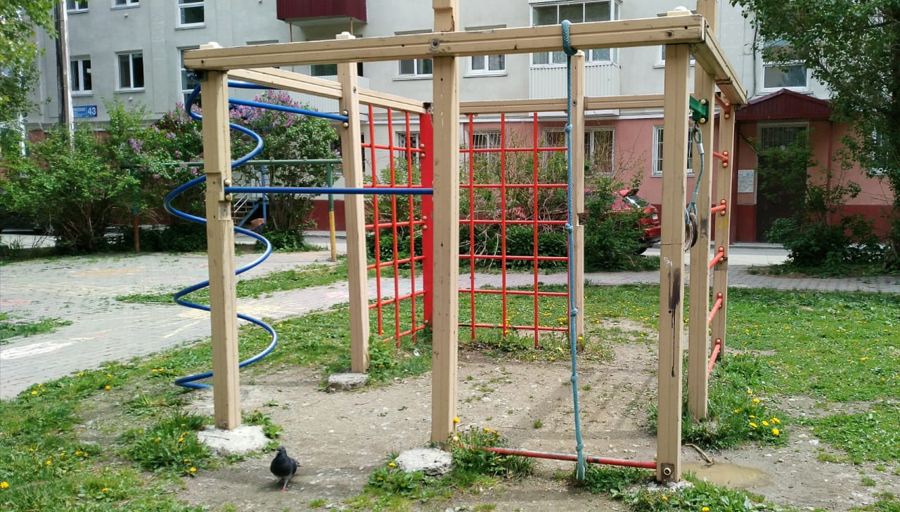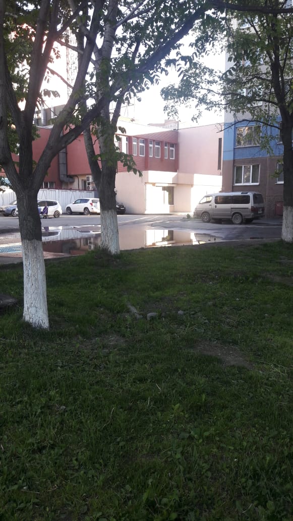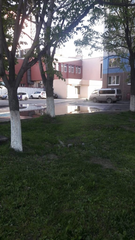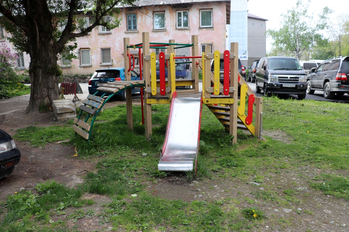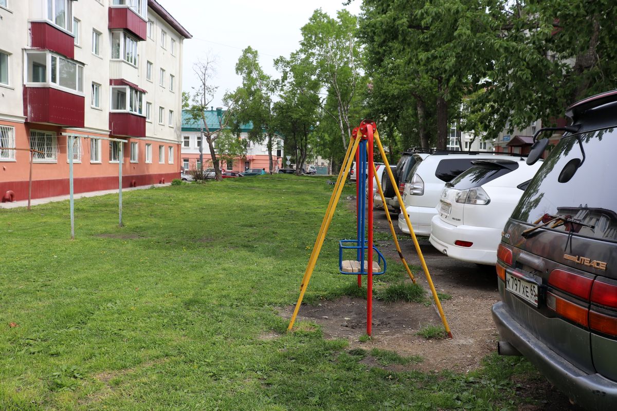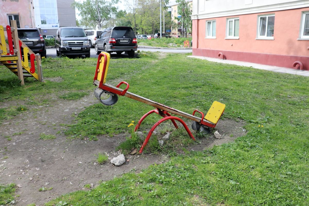 Сахалинская, 41. Лужа под детскими качелями уже высохла. Ненадолго.