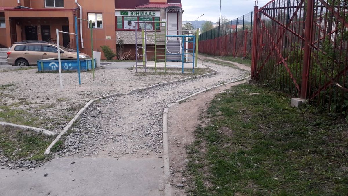 Сахалинская, 43. Скамейка поломана. на горке – опасно, песочница самодельная. Да и песок какой попало по нормам военного времени. Сахалинская, 43. “Бейтесь спортсмены головой об куски бетона, укрепляйте черепные коробки!”