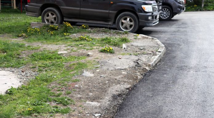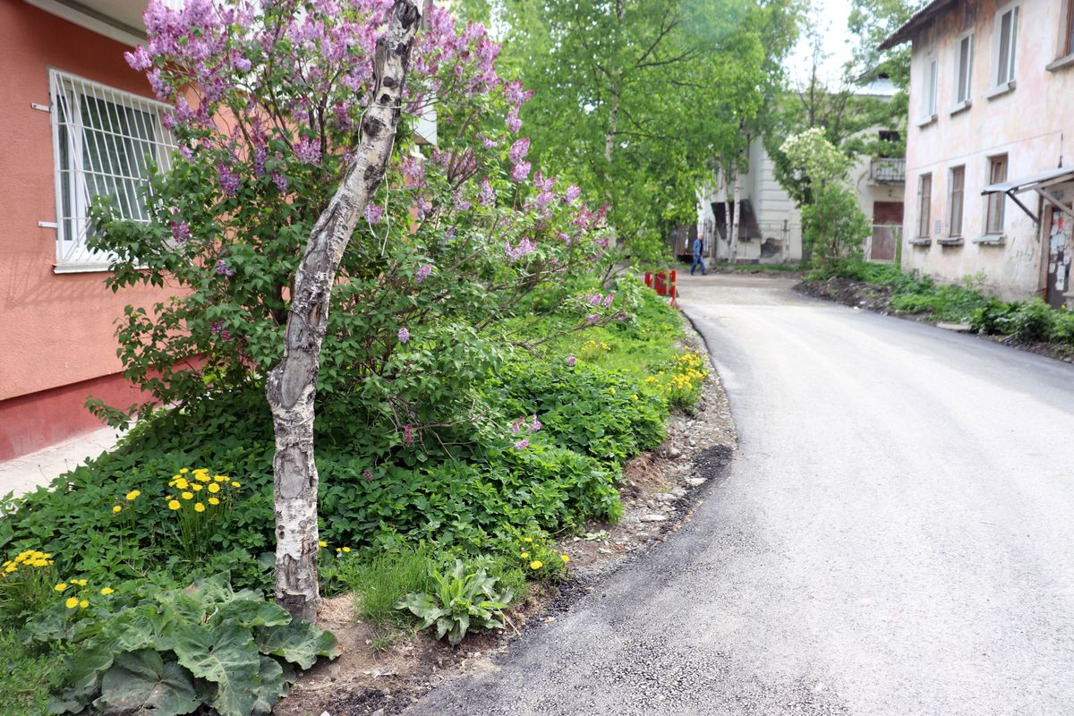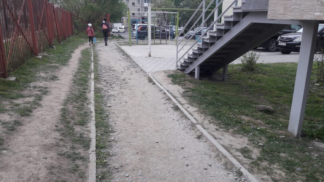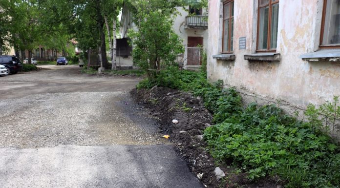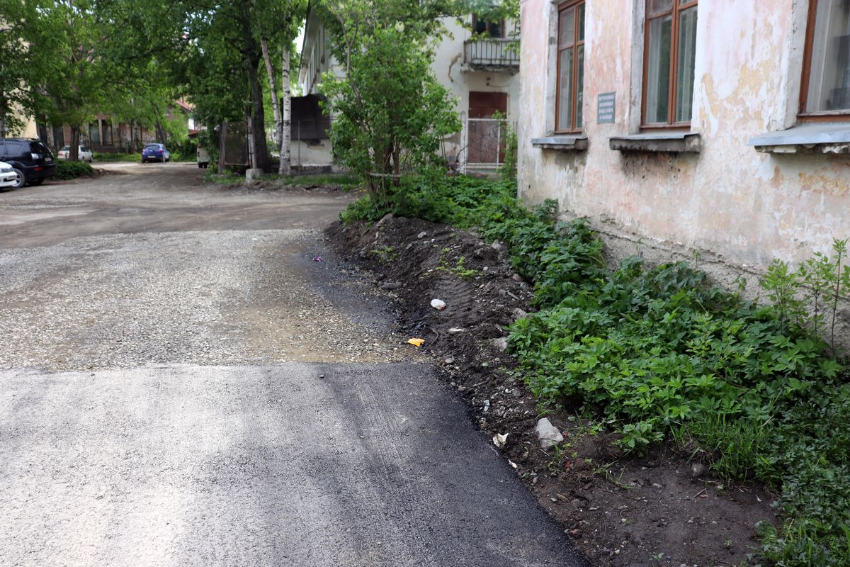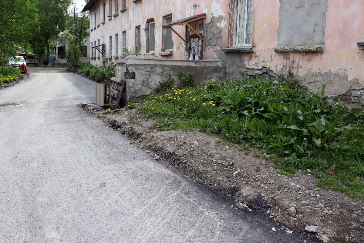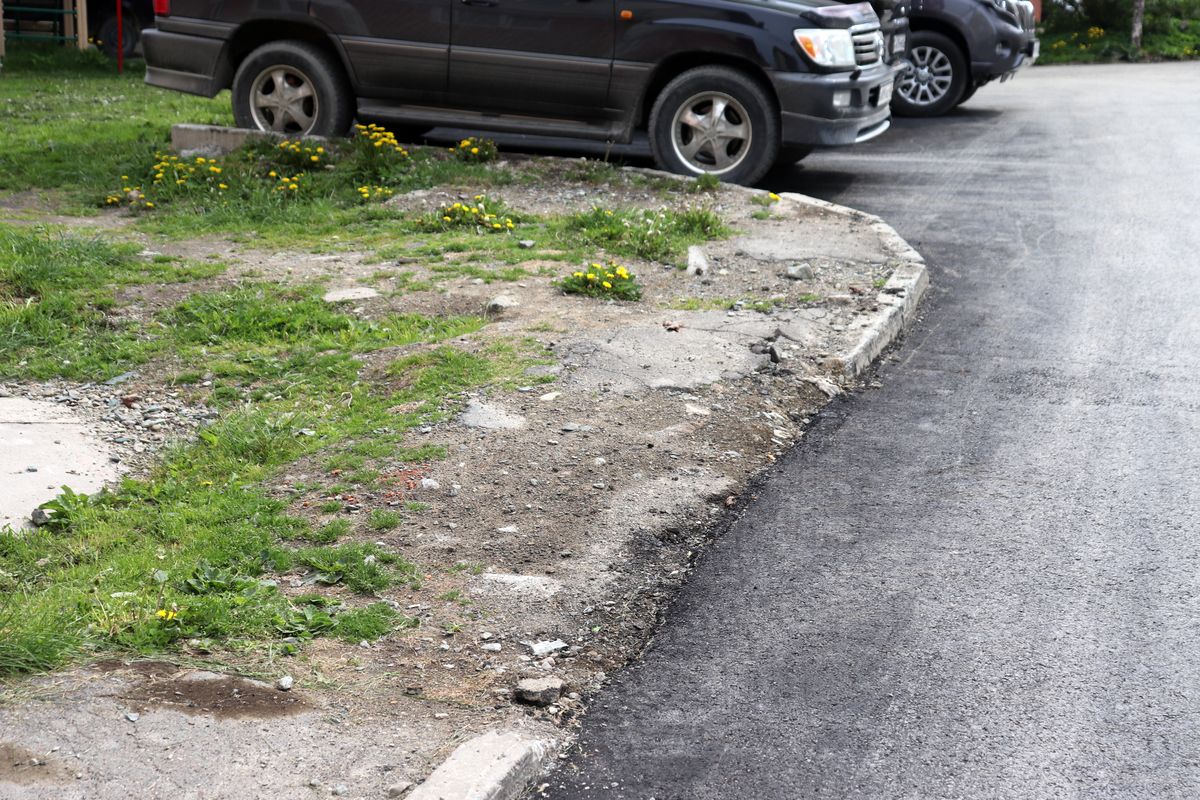 При подготовке асфальтирования проезда дорожники попросту сгребли почву к стенам прилегающего дома, замена бордюрного камня не проводилась, пешеходные дорожки остались в прежнем виде.