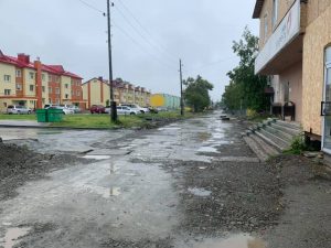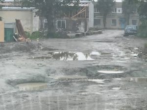 Здесь попытка городских властей привести в порядок электрические сети дома по улице Чехова, 3 обернулось загрязнением обширной территории. Мы уже писали на своих страницах о странном кабеле, который уютно примостился на ветвях деревьев. Похоже, силовой кабель на деревьях оказался казусом, и его, спустя много лет, оперативно прикопали после нашей публикации. Траншея от трансформатора до вновь установленного столба протянулась через дорогу. Следы этих работ формально ликвидированы, асфальт разрушен, на проезжей части теперь легкая канава, выезд со двора превратился в аналог лесовозной дороги, а грязь заботливо переносится колесами авто на центральные улицы областного центра, которая, впоследствии, превращается в тонкодисперсную пыль.
