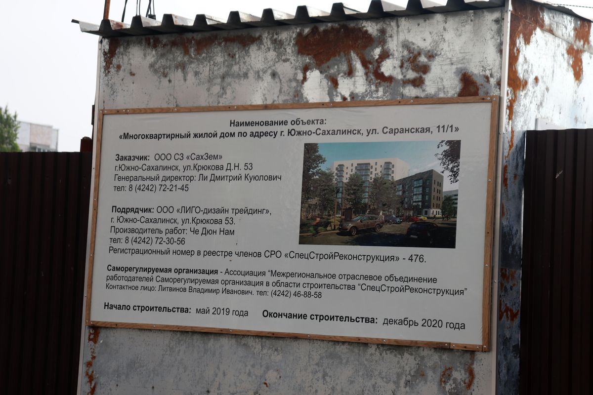 Стоит отметить, объект “многоквартирный жилой дом по улице Саранская 11/1” в реестре поднадзорных объектов капитального строительства Инспекции строительного надзора Сахалинской области не состоит, извещение о начале строительства в адрес инспекции не поступало.
