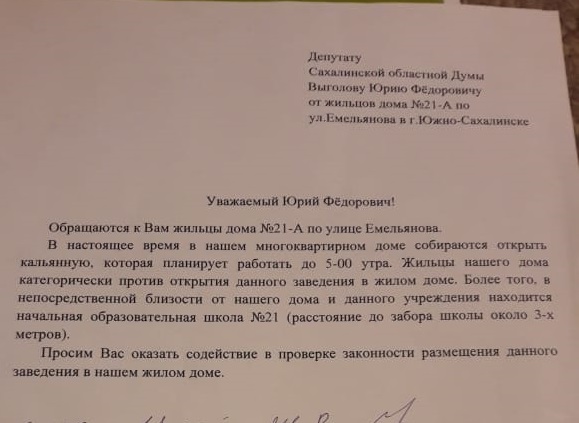 Жители девятого микрорайона областного центра не на шутку встревожены планами предпринимателя, который решил открыть в жилом доме, неподалеку от школы, “курительное” заведение – кальянную. С просьбой о помощи они обратились к помощнику депутата Государственной Думы Галине Подойниковой и руководителю фракции КПРФ в областной Думе Юрию Выголову.