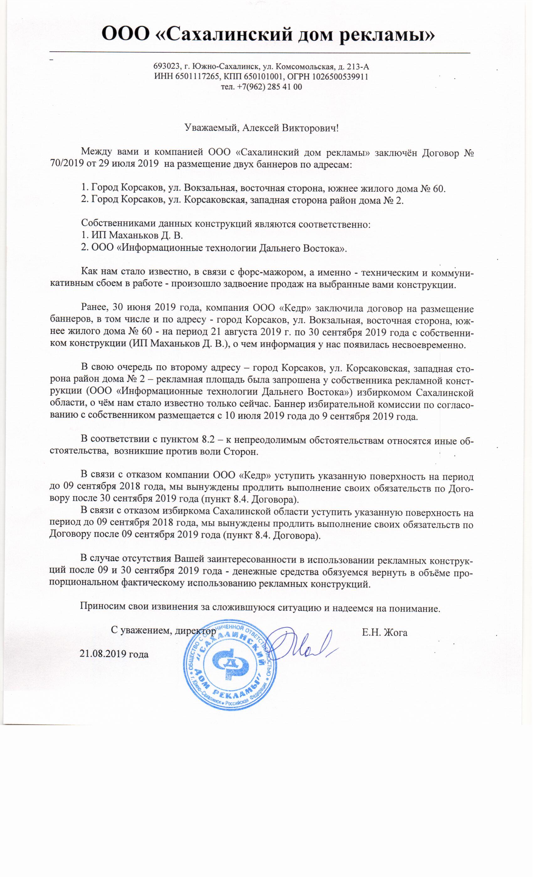 А в Корсакове жители районного центра оказались лишены возможности выбора между заявленными кандидатами в губернаторы. “Сахалинский дом рекламы” отказал в размещении политической рекламы в виду того, что днем позже одну из конструкций якобы арендовали сторонние клиенты, а на вторую заявили свои права в…Избирательной комиссии Сахалинской области.