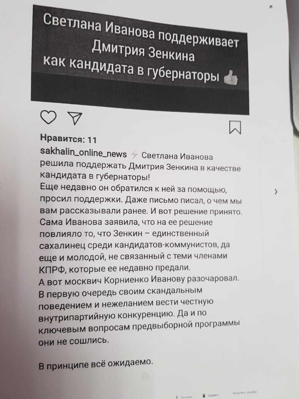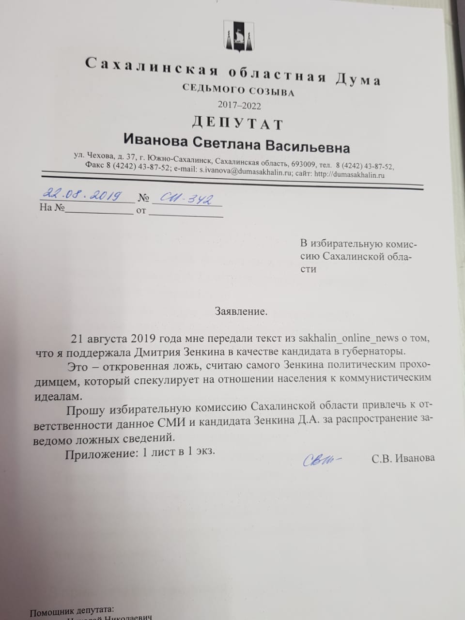 Светлана Иванова обращается в Избирательную комиссию Сахалинской области с просьбой провести проверку и привлечь к ответственности СМИ, замешанного в распространении заведомо ложной информации о якобы оказываемой ею поддержке кандидата, не имеющем отношения к политической партии КПРФ, и самого кандидата в губернаторы Зенкина.