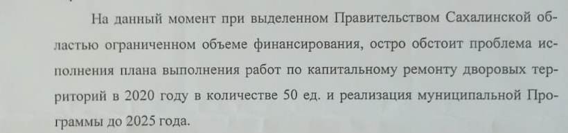 Губернатор Сахалинской области Валерий Лимаренко уже неоднократно заявлял о том, что чиновникам необходимо активизировать работы по ремонту муниципальных дорог и дворовых территорий – «Берите денег на столько, сколько сможете освоить». А министр сахалинского ЖКХ Дмитрий Зайцев, в своем письменном ответе от 16 сентября 2019 года, вновь сетует на недостаток средств и считает, что реализация программы капитального ремонта дворов в Южно-Сахалинске под угрозой.