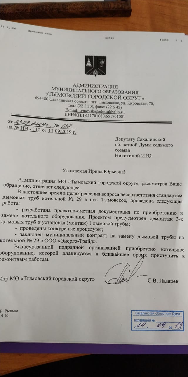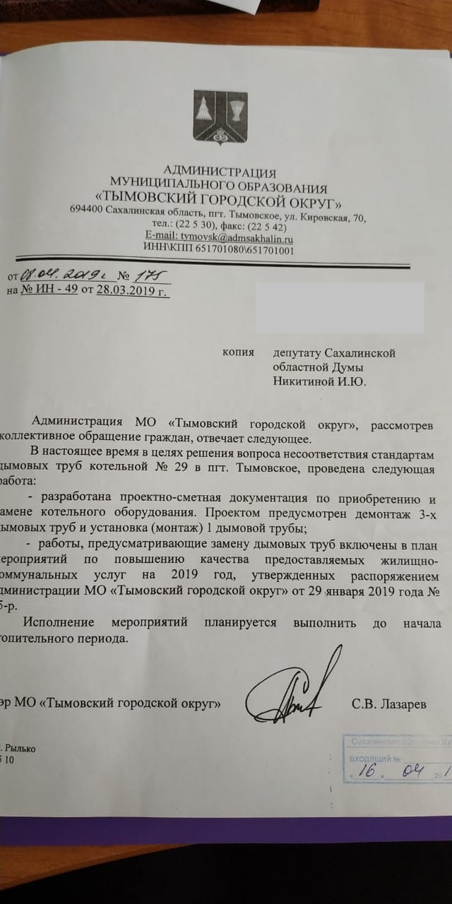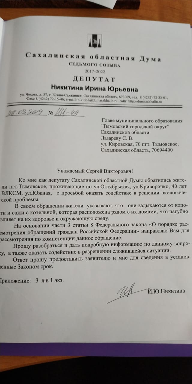 Жители поселка Тымовское устали вдыхать черный дым, который распространяет вокруг местная котельная. Местные власти, которые поздно обратили внимание на эту проблему, вынудили северян написать письмо депутату Сахалинской областной думы Ирине Никитиной.