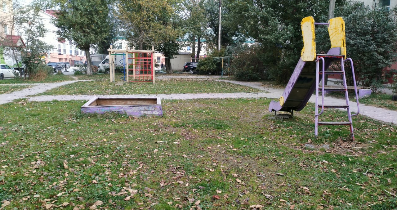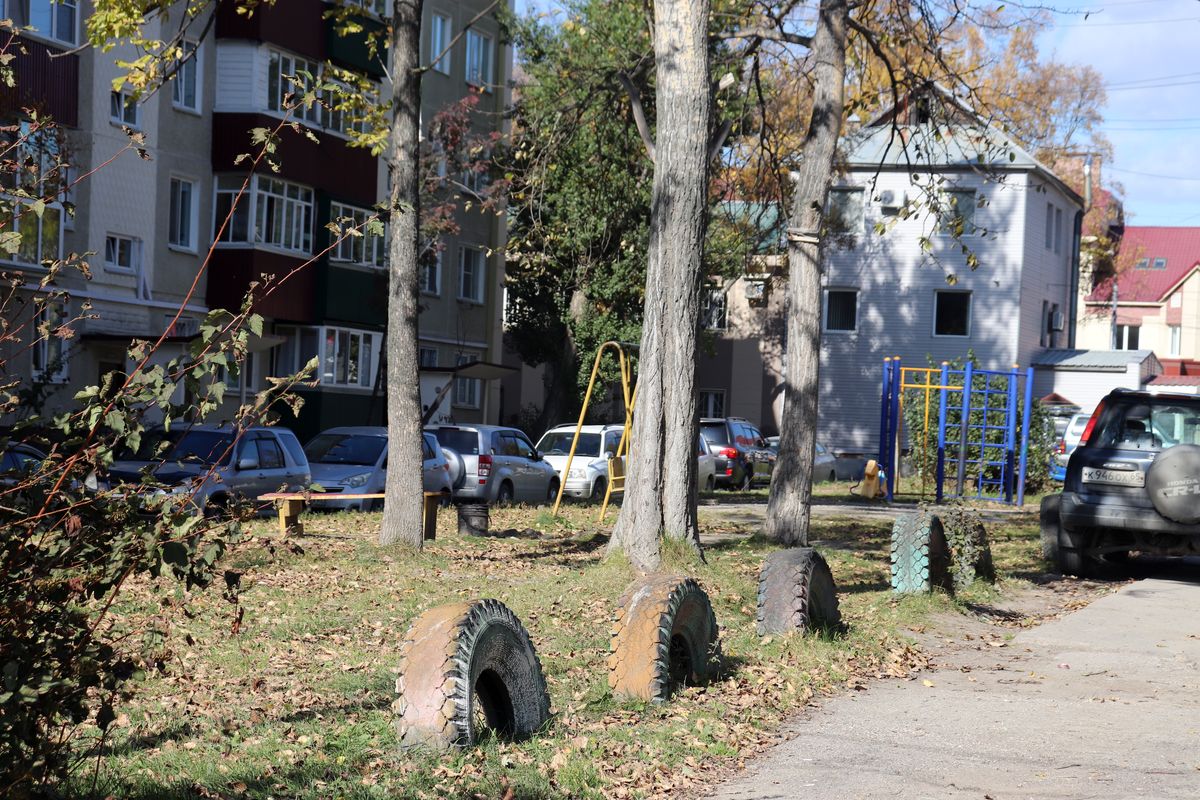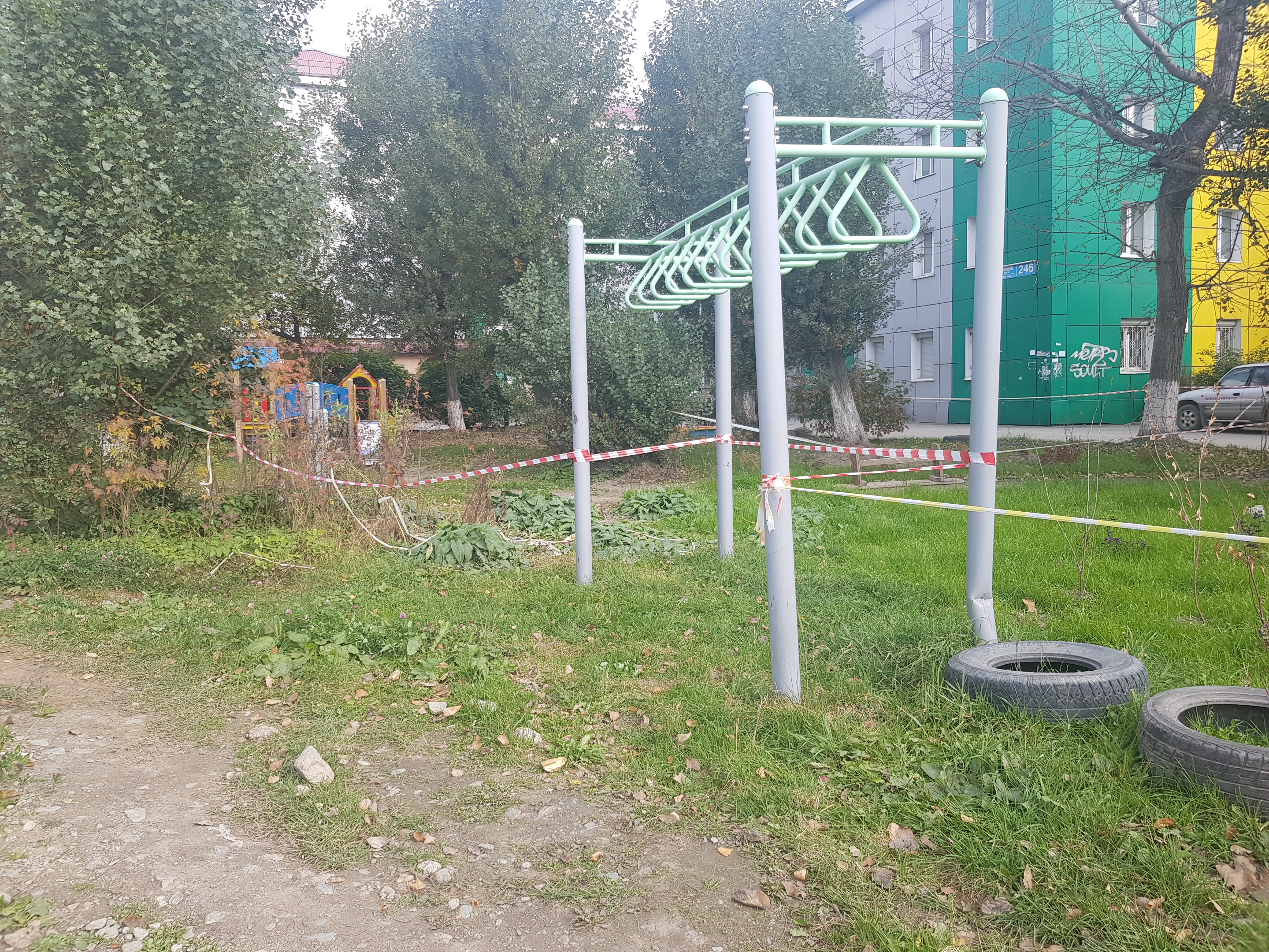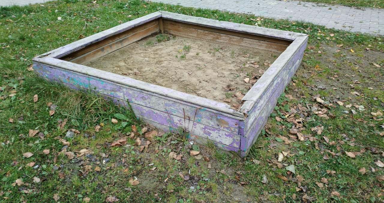 Скамейка, на которой любят отдыхать местные пенсионеры, имеет изысканные формы, напоминающие религиозные объекты (два креста), изготовлена с применением бывших в употреблении столбов площадки для сушки белья. Детская площадка расположена прямо на газоне, огорожена сигнальной лентой во имя безопасности подрастающего поколения. А песочница закрыта на замок – чтобы песок редкого вида не был похищен, а маленькие дети в нее не проваливались. Понятно, это забота и это развитие. Новые стандарты комфортной среды в повседневную жизнь.