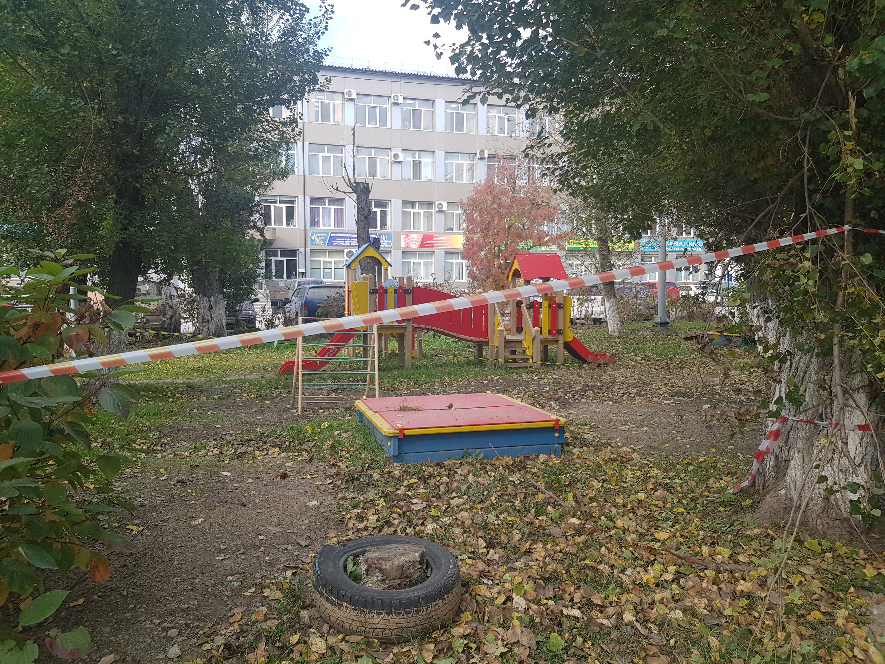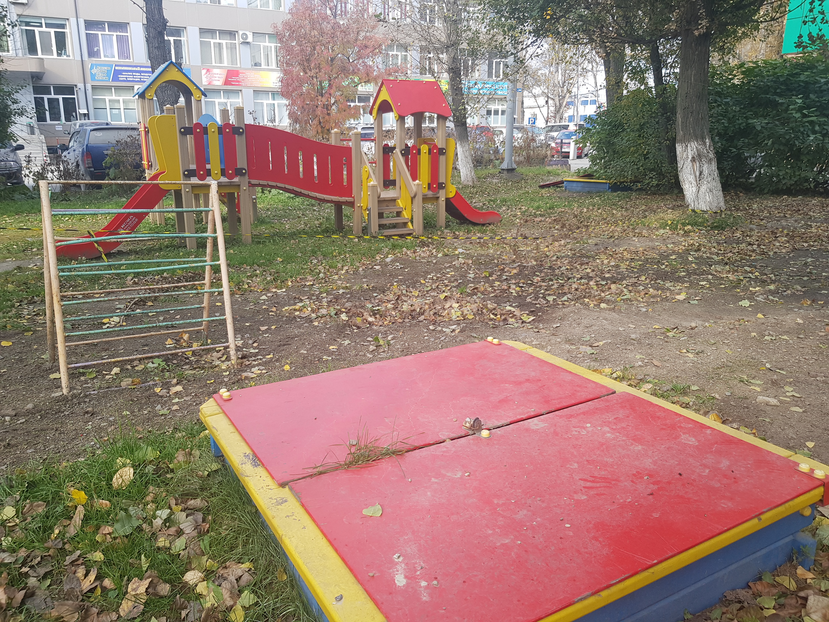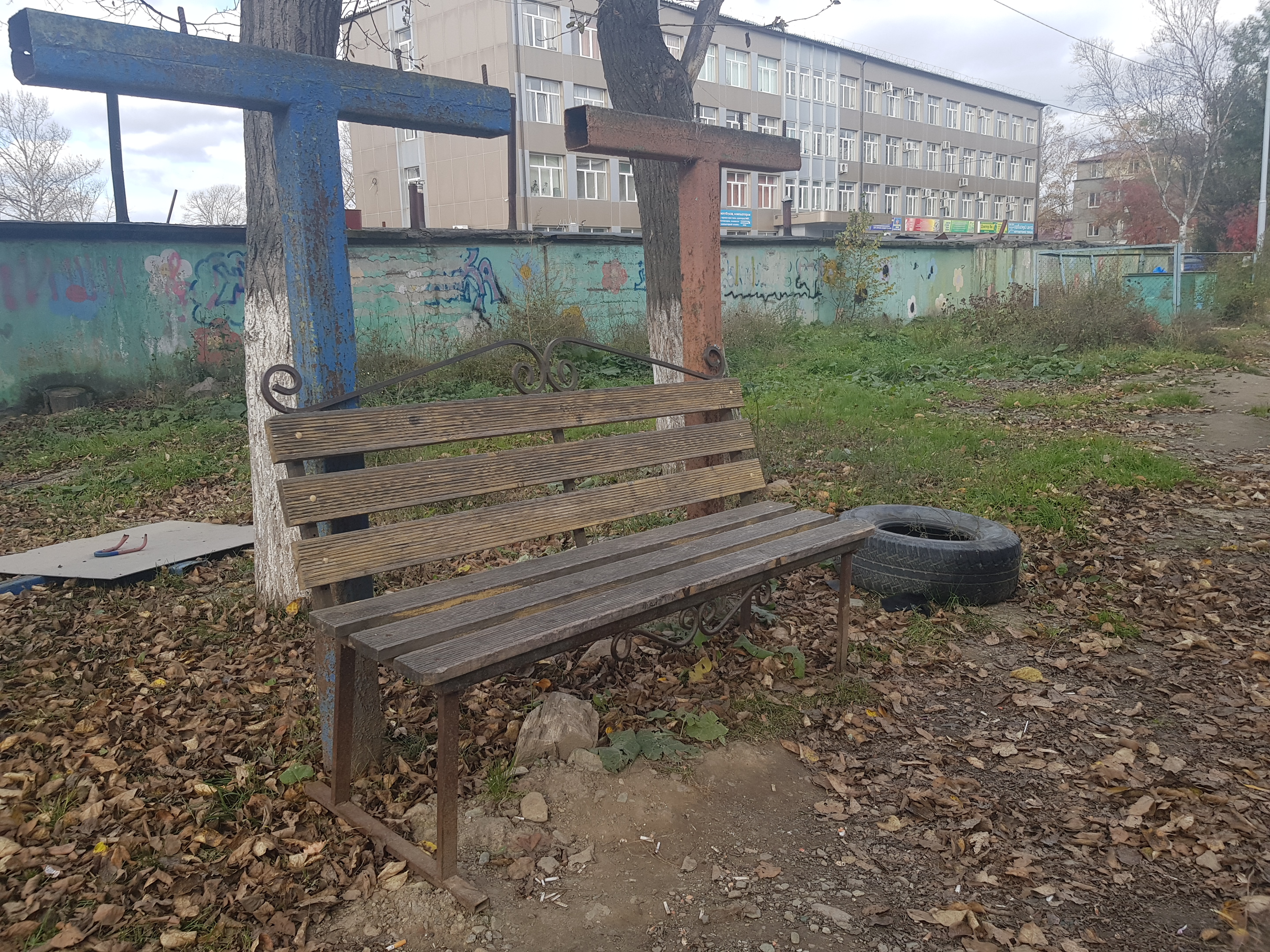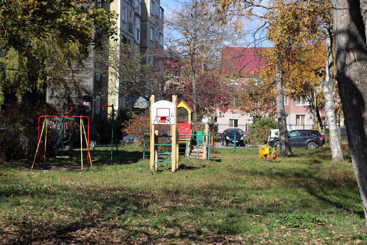 Скамейка, на которой любят отдыхать местные пенсионеры, имеет изысканные формы, напоминающие религиозные объекты (два креста), изготовлена с применением бывших в употреблении столбов площадки для сушки белья. Детская площадка расположена прямо на газоне, огорожена сигнальной лентой во имя безопасности подрастающего поколения. А песочница закрыта на замок – чтобы песок редкого вида не был похищен, а маленькие дети в нее не проваливались. Понятно, это забота и это развитие. Новые стандарты комфортной среды в повседневную жизнь.