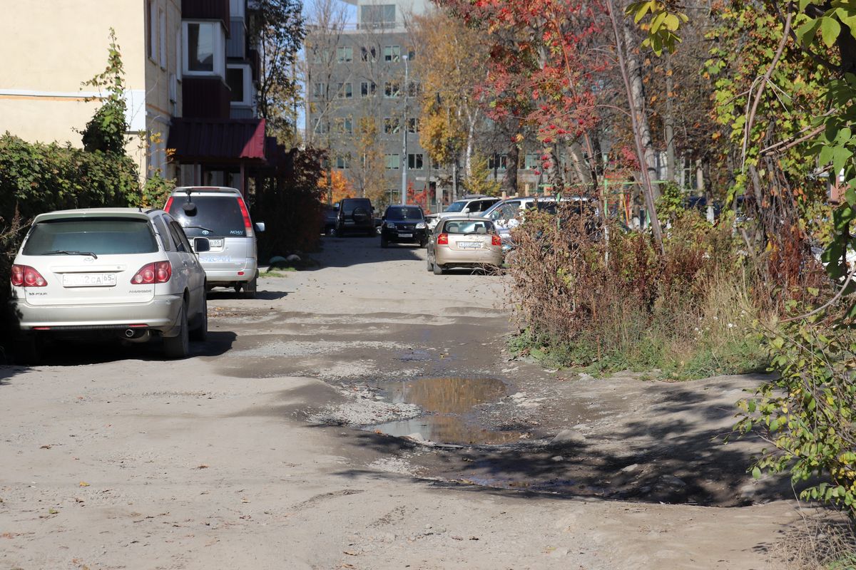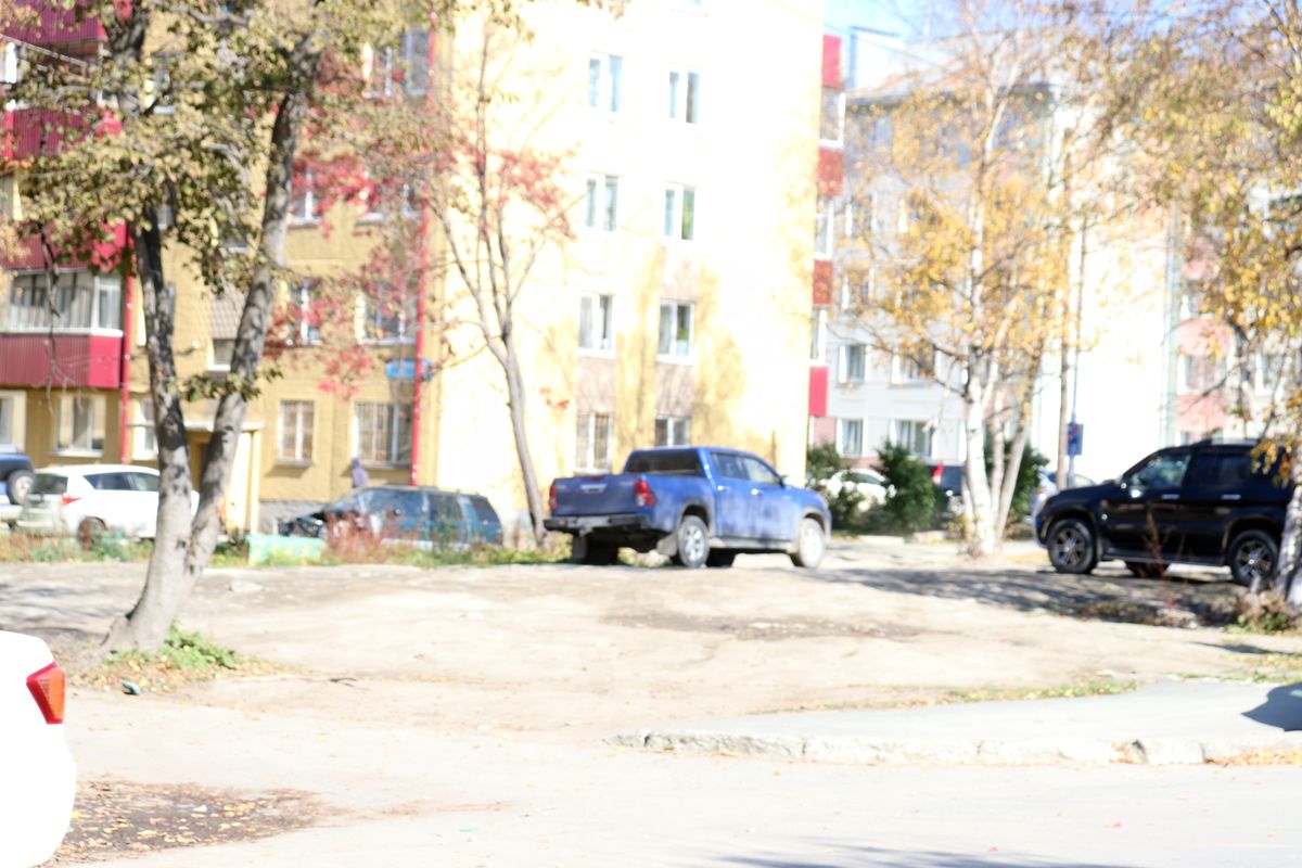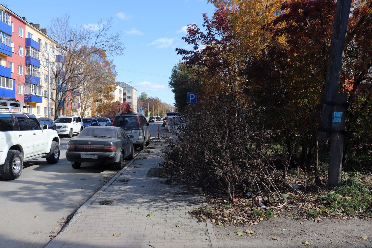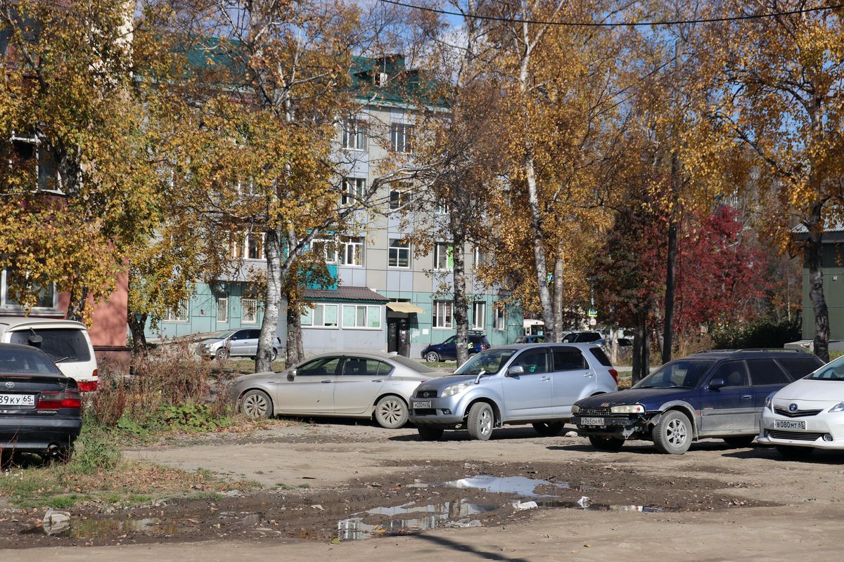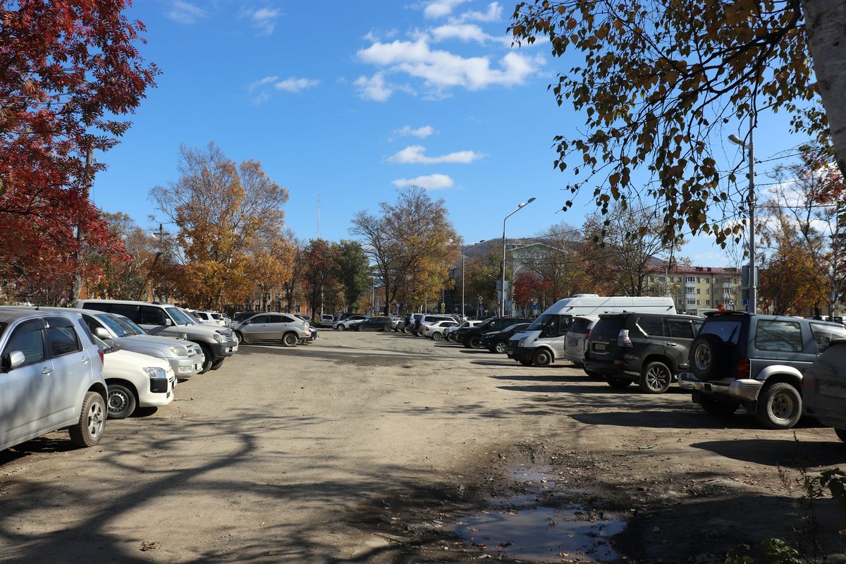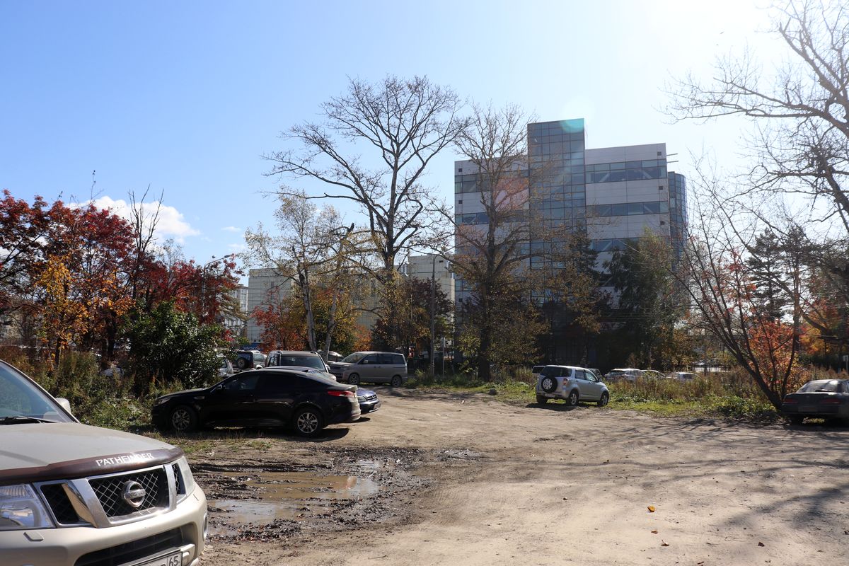 Останавливаемся не перед «лицом», а перед «задом» правительства Сахалинской области – парковка автотранспорта многочисленных офисных служащих и их посетителей на улице Хабаровской. Ее активно рекламируют в зимний период как площадку, где можно оставить свой автотранспорт в период непогоды, дабы не загромождать дворы и дать возможность расчистить их территорию.