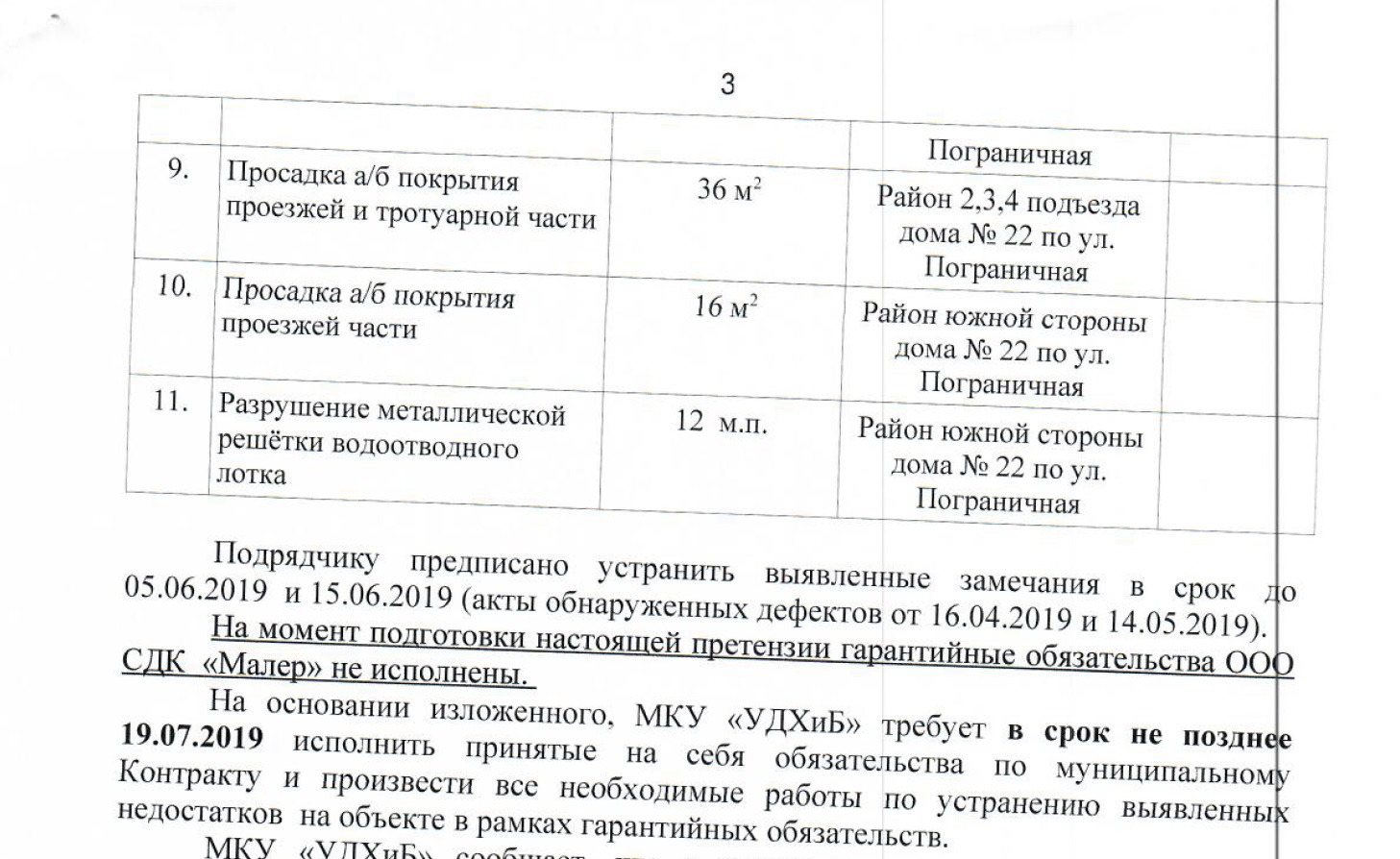 Справедливости ради стоит отметить – Управлением дорожного хозяйства и благоустройства администрации областного центра составлен акт, в котором специалисты потребовали устранить выявленные дефекты, возникшие в рамках гарантийного срока, который составляет пять лет. В нем действительно фигурирует “асфальто-бетонное” покрытие пешеходной части двора, которого мы не обнаружили в принципе. Да и срок устранения возникших дефектов (провалы) уже благополучно остался в прошлом.