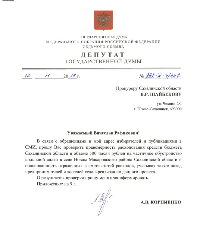 В обращении к прокурору Вячеславу Шайбекову Алексей Корниенко отмечает, что в частичное обустройство школьной аллеи внесли вклад жители села и предприниматели. И просит проверить «правомерность расходования средств бюджета Сахалинской области… и обоснованность отраженных в смете статей расходов».