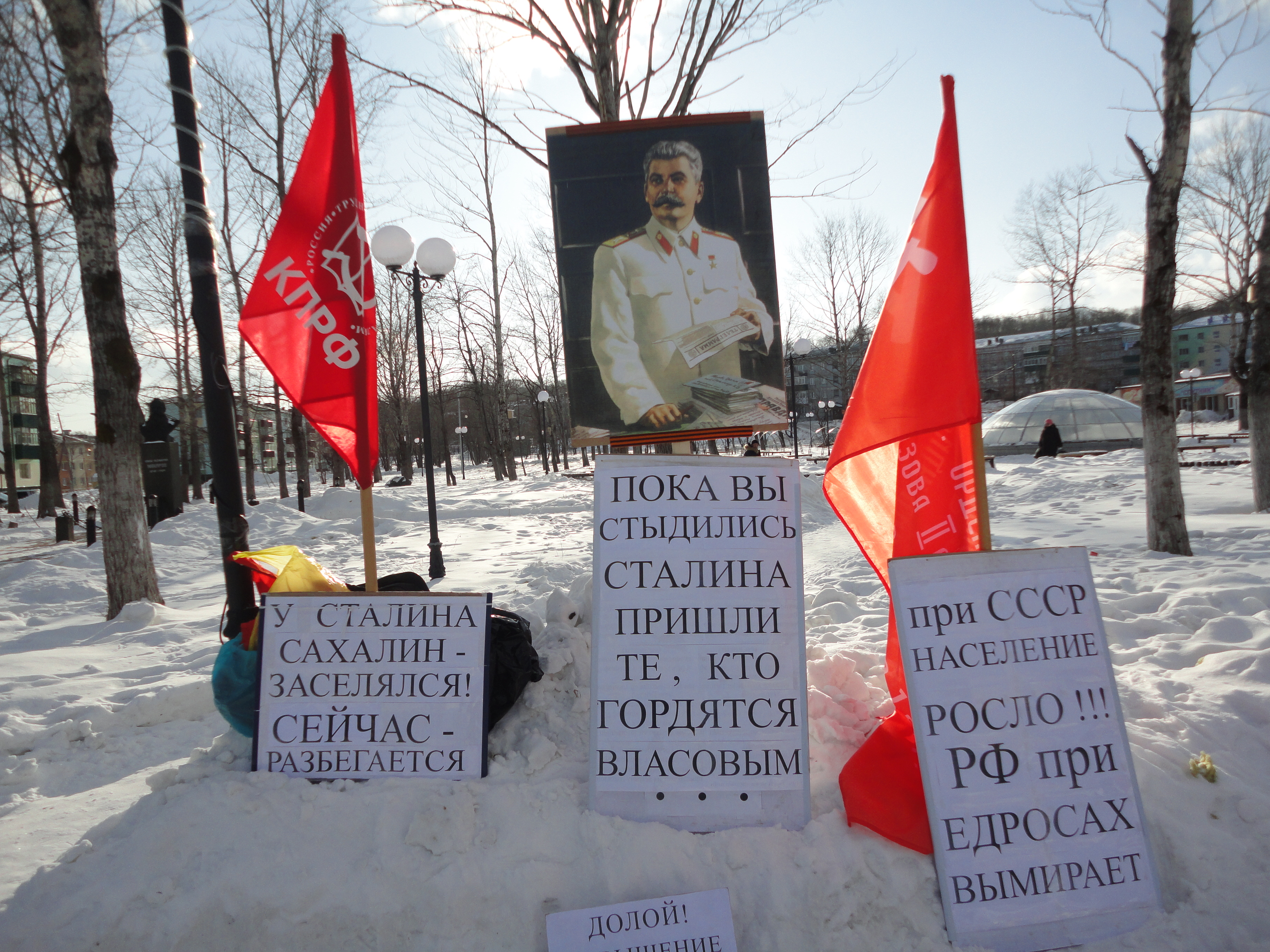 Сахалинские коммунисты и их сторонники торжественно отметили 140-ю годовщину со дня рождения руководителя советского государства И.В. Сталина. В Южно-Сахалинске прошло торжественное собрание, а в городах пикеты.