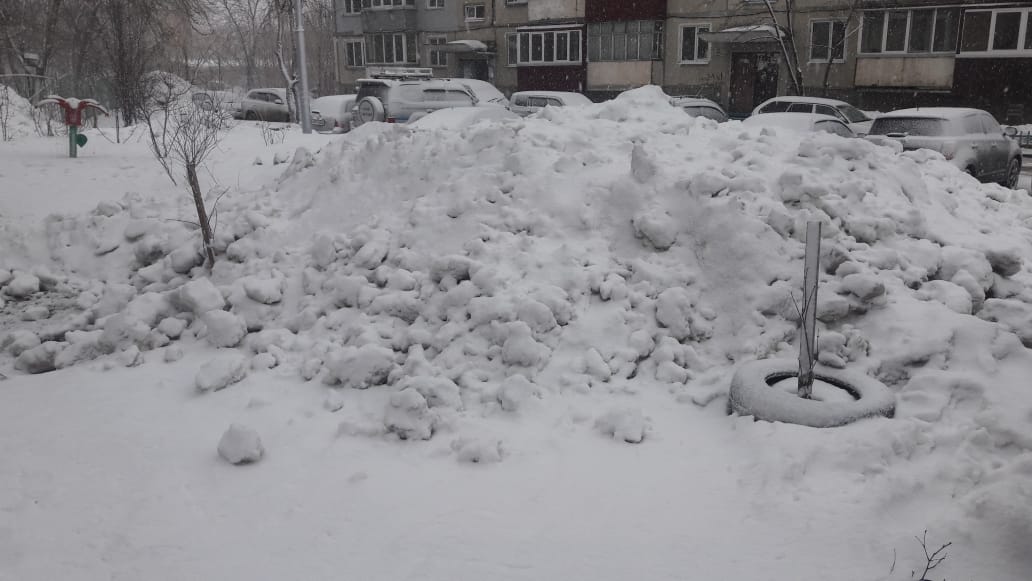 Жители девятого микрорайона жалуются на то, что снег с территории их двора не вывозится, а саженцы деревьев гибнут под кучами обледенелого снега.
