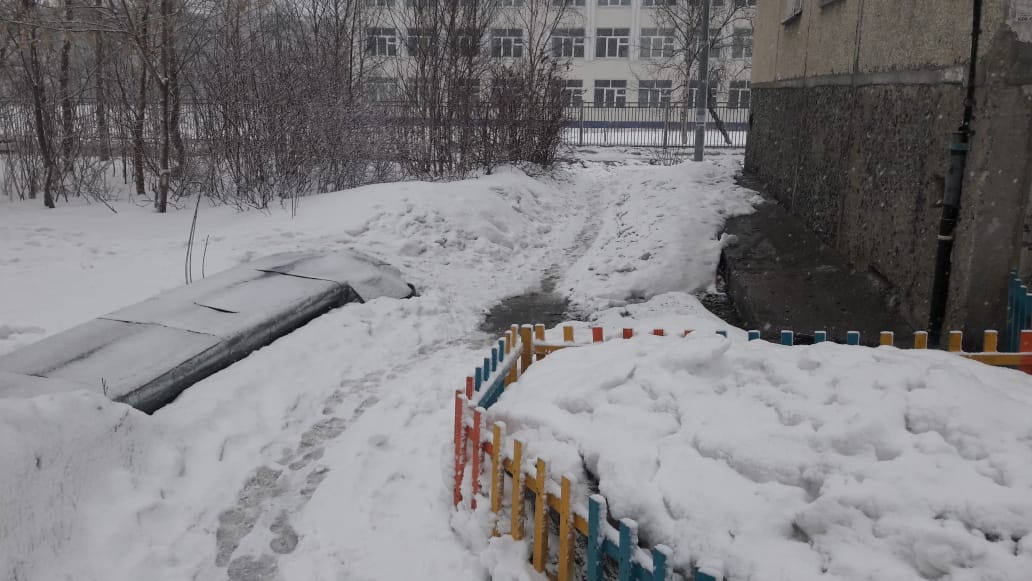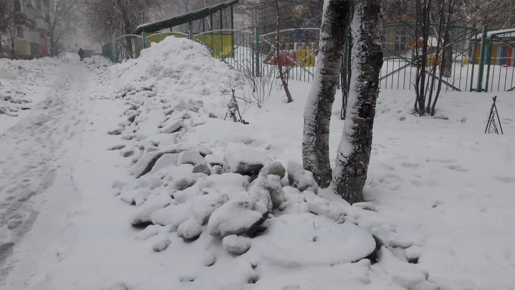 Летом эта территория считалась образцовой. Пару лет назад провели капремонт и жители сами высадили цветы, кустарники и молодые деревца. Пришла зима, замело, жэк чистить и вывозить снег не собирается – говорят дорого!