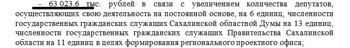 – 63 миллионов 23 тысячи 600 рублей в связи с увеличением количества депутатов, осуществляющих свою деятельность на постоянной основе, на 6 единиц, численности государственных гражданских служащих Сахалинской областной Думы на 13 единиц, численности государственных гражданских служащих Правительства Сахалинской области на 11 единиц в целях формирования регионального проектного офиса;