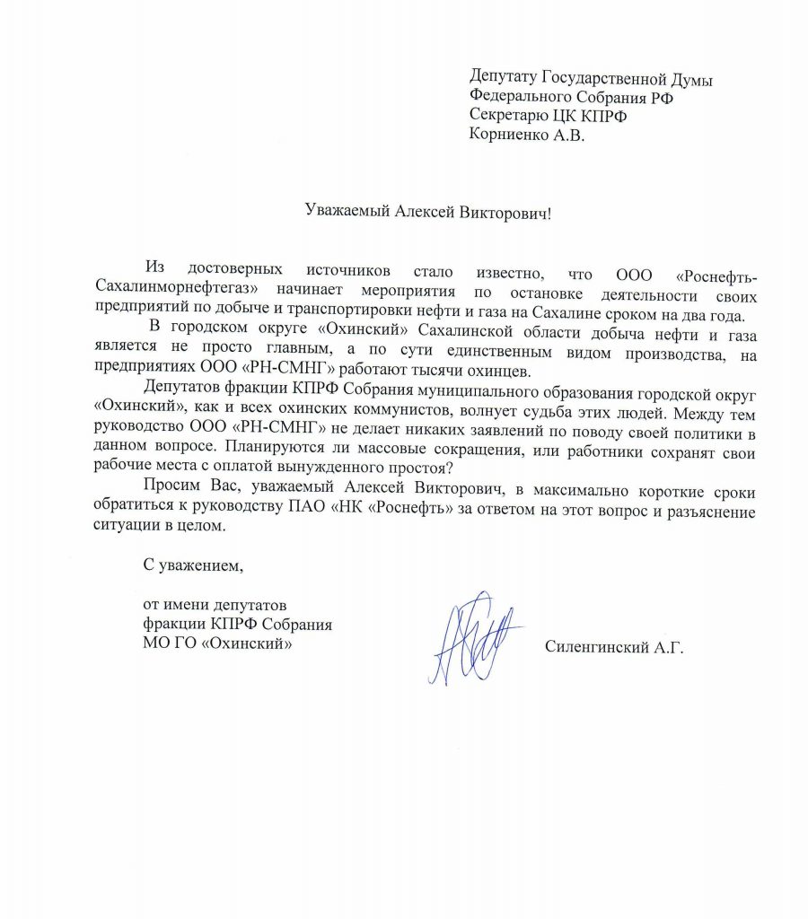 Наша фракция в охинском городском Собрании обратилась к депутату Государственной Думы, секретарю ЦК КПРФ Алексею Викторовичу Корниенко с просьбой оказать содействие в выяснении этого вопроса непосредственно с руководством ПАО «НК «Роснефть».