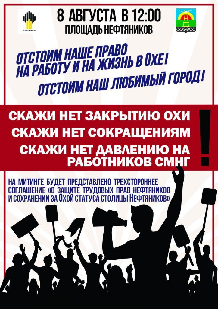 Приглашаем всех неравнодушных к судьбе родного города охинцев принять участие в митинге, который состоится 8 августа 12:00 на площади Нефтяников.