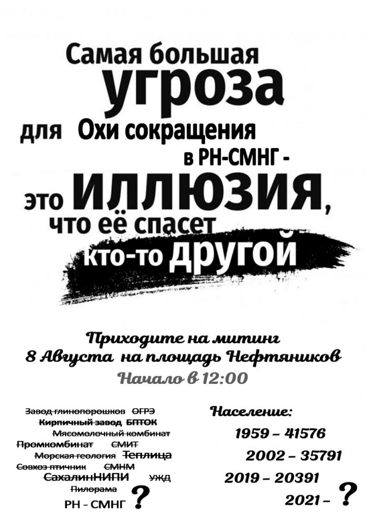 Важно понимать, что продление коллективного договора с работниками ООО «РН-Сахалинморнефтегаз» до 01.07.2023 г., которого удалось добиться, совершенно не гарантирует защиту от сокращений на протяжении этого периода. И совсем ничего не стоят пустые, ничем не подкрепленные слова. Под ласковые успокоительные речи Оху могут за пару лет стереть с карты Сахалина.