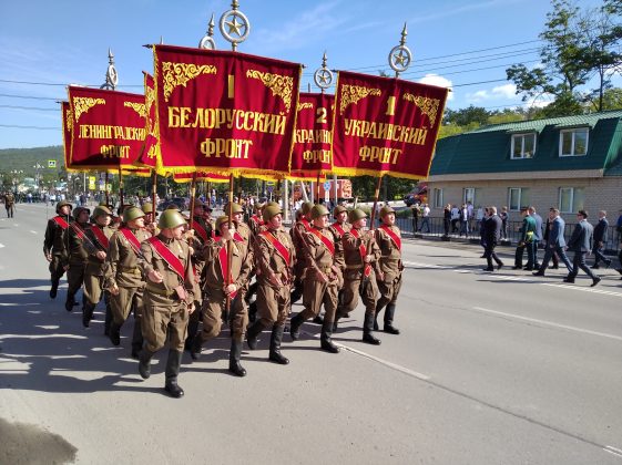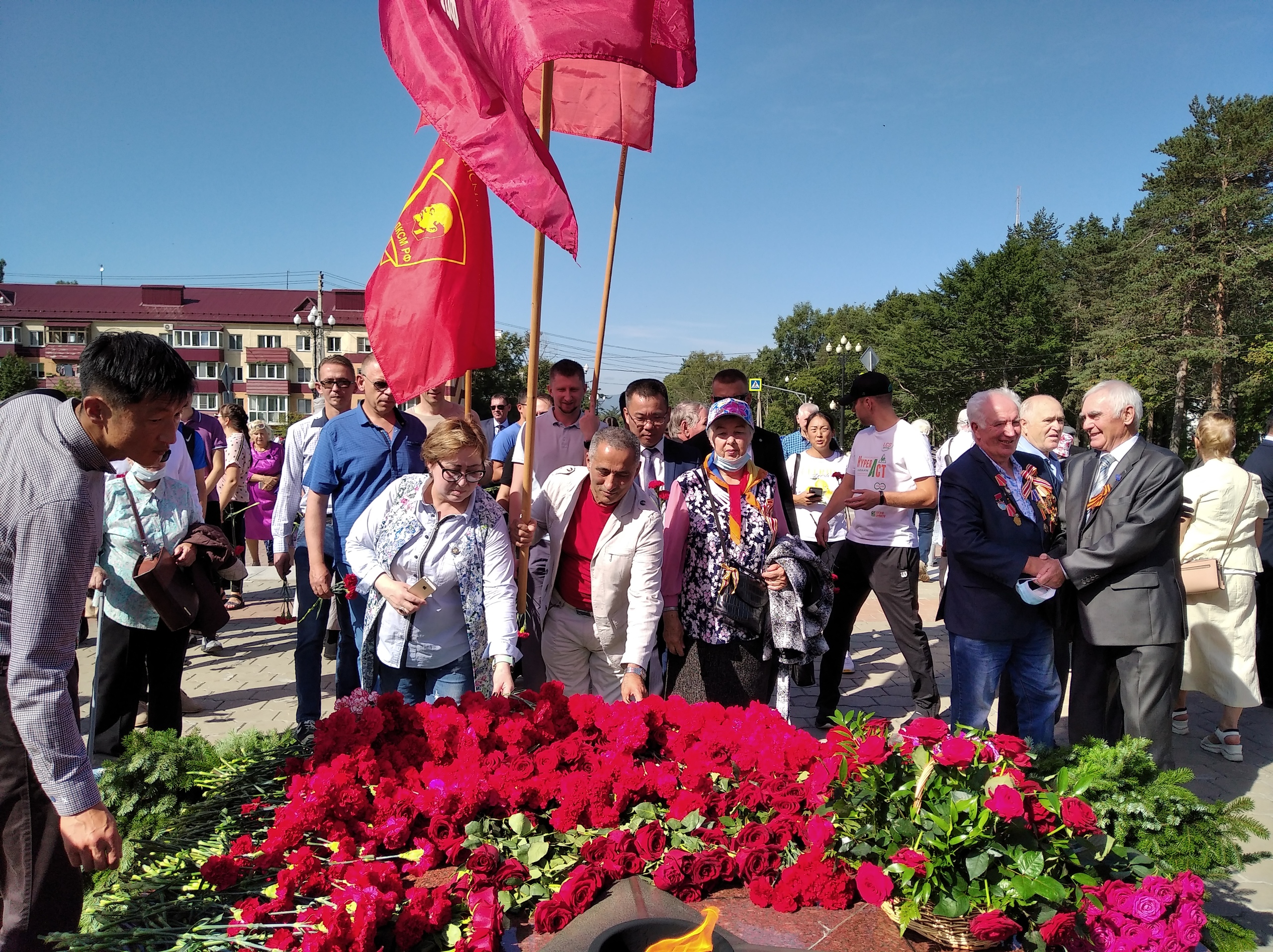 г.Южно-Сахалинск. Представители городской партийной организации г. Южно-Сахалинска а также представители Ленинского комсомола приняли участие в параде, а после возложили цветы к Памятнику советским воинам, павшим в боях за освобождение Южного Сахалина и Курильских островов.