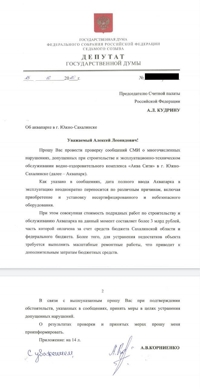 Сахалинский аквапарк , на строительство которого потрачены миллиарды, до сих пор не введен в эксплуатацию должным образом. Депутат ГД Алексей Корниенко: Прошу провести проверку и принять меры