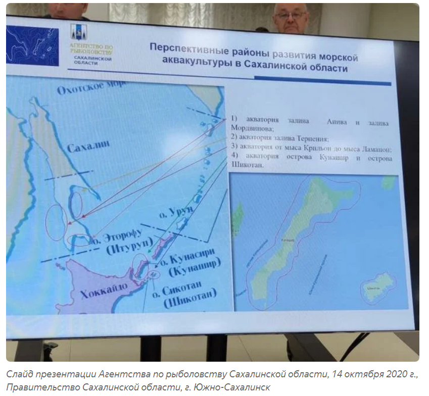 Руководителем Агентства по рыболовству Сахалинской области И.Б. Радченко был сделан доклад «О развитии аквакультуры в Сахалинской области». В ходе доклада на бланке Агентства по рыболовству демонстрировался слайд «Перспективные районы развития морской аквакультуры в Сахалинской области».