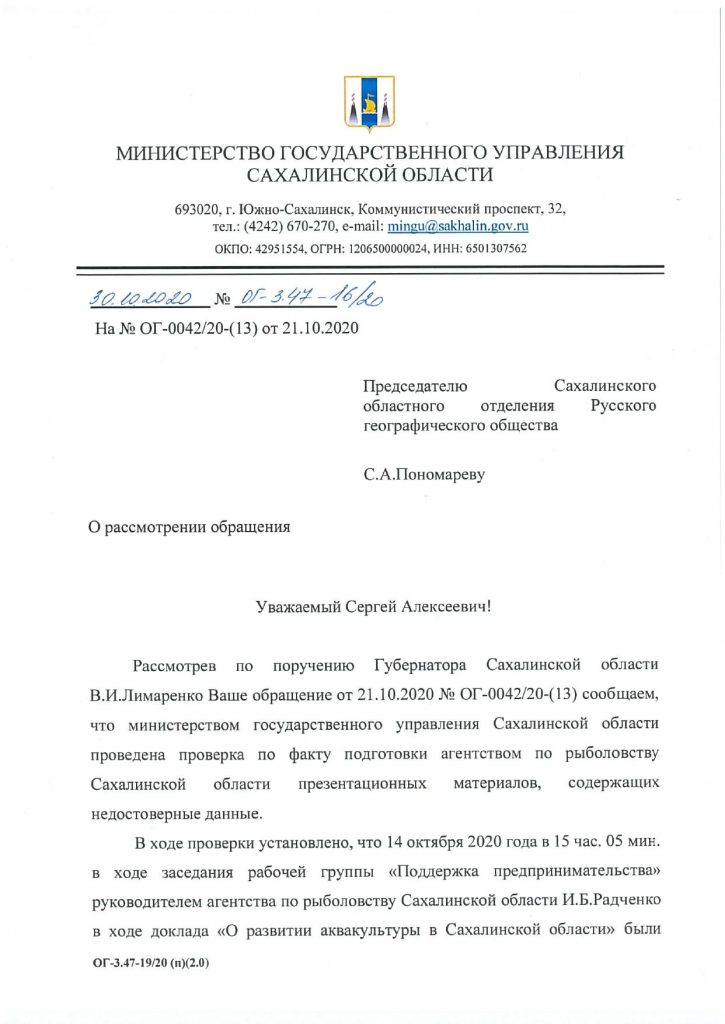 Из ответа, подготовленного по поручению Губернатора Сахалинской области В.И. Лимаренко, от 30 октября следует, что распоряжением Губернатора от 26 октября № 189-к к Радченко И.Б., руководителю агентства по рыболовству Сахалинской области, применено дисциплинарное взыскание – выговор.